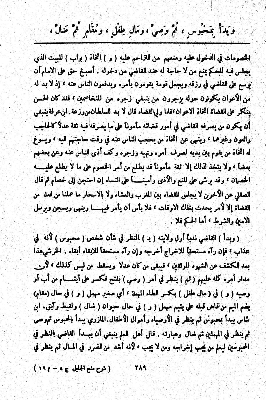 (وَبَدَأَ) الْقَاضِي نَدْبًا أَوَّلَ وِلَايَتِهِ (بِ) النَّظَرِ فِي شَأْنِ شَخْصٍ (مَحْبُوسٍ) لِأَنَّهُ فِي عَذَابٍ، فَإِنْ رَآهُ مُسْتَحَقًّا لِلْإِخْرَاجِ أَخْرَجَهُ وَإِنْ رَآهُ مُسْتَحَقًّا لِلْإِبْقَاءِ أَبْقَاهُ. الْخَرَشِيُّ هَذَا بَعْدَ الْكَشْفِ عَنْ الشُّهُودِ الْمُوثَقِينَ، فَيَبْقَى مَنْ كَانَ عَدْلًا وَيَسْقُطُ مَنْ لَيْسَ كَذَلِكَ، لِأَنَّ مَدَارَ أَمْرِهِ كُلِّهِ عَلَيْهِمْ (ثُمَّ) يَنْظُرُ فِي أَمْرِ (وَصِيٍّ) بِفَتْحٍ فَكَسْرٍ عَلَى أَيْتَامٍ مِنْ أَبٍ أَوْ وَصِيِّهِ (وَ) فِي (مَالِ طِفْلٍ) بِكَسْرِ الطَّاءِ الْمُهْمَلَةِ، أَيْ صَغِيرٍ مُهْمَلٍ (وَ) فِي حَالِ (مُقَامٍ) بِضَمِّ الْمِيمِ مِنْ قَاضٍ قِبَلَهُ عَلَى يَتِيمٍ مُهْمَلٍ (وَ) فِي حَالِ حَيَوَانٍ (ضَالٍّ) وَلَقِيطٍ وَآبِقٍ. ابْنُ شَاسٍ يَبْدَأُ بِمَحْبُوسٍ ثُمَّ يَنْظُرُ فِي الْأَوْصِيَاءِ وَأَمْوَالِ الْأَطْفَالِ. الْمَازِرِيُّ يَبْدَأُ بِالْمَحْبُوسِ ثُمَّ وَصِيٍّ ثُمَّ يَنْظُرُ فِي الْمُهْمَلِينَ ثُمَّ ضَالٍّ وَعِبَارَتُهُ. قَالَ أَهْلُ الْعِلْمِ يَنْبَغِي أَنْ يَبْدَأَ الْقَاضِي بِالنَّظَرِ فِي الْمَحْبُوسِينَ لِيَعْلَمَ مَنْ يَجِبُ إخْرَاجُهُ وَمَنْ لَا يَجِبُ لِأَنَّهُ أَشَدُّ مِنْ الضَّرَرِ فِي الْمَالِ ثُمَّ يَنْظُرُ فِي