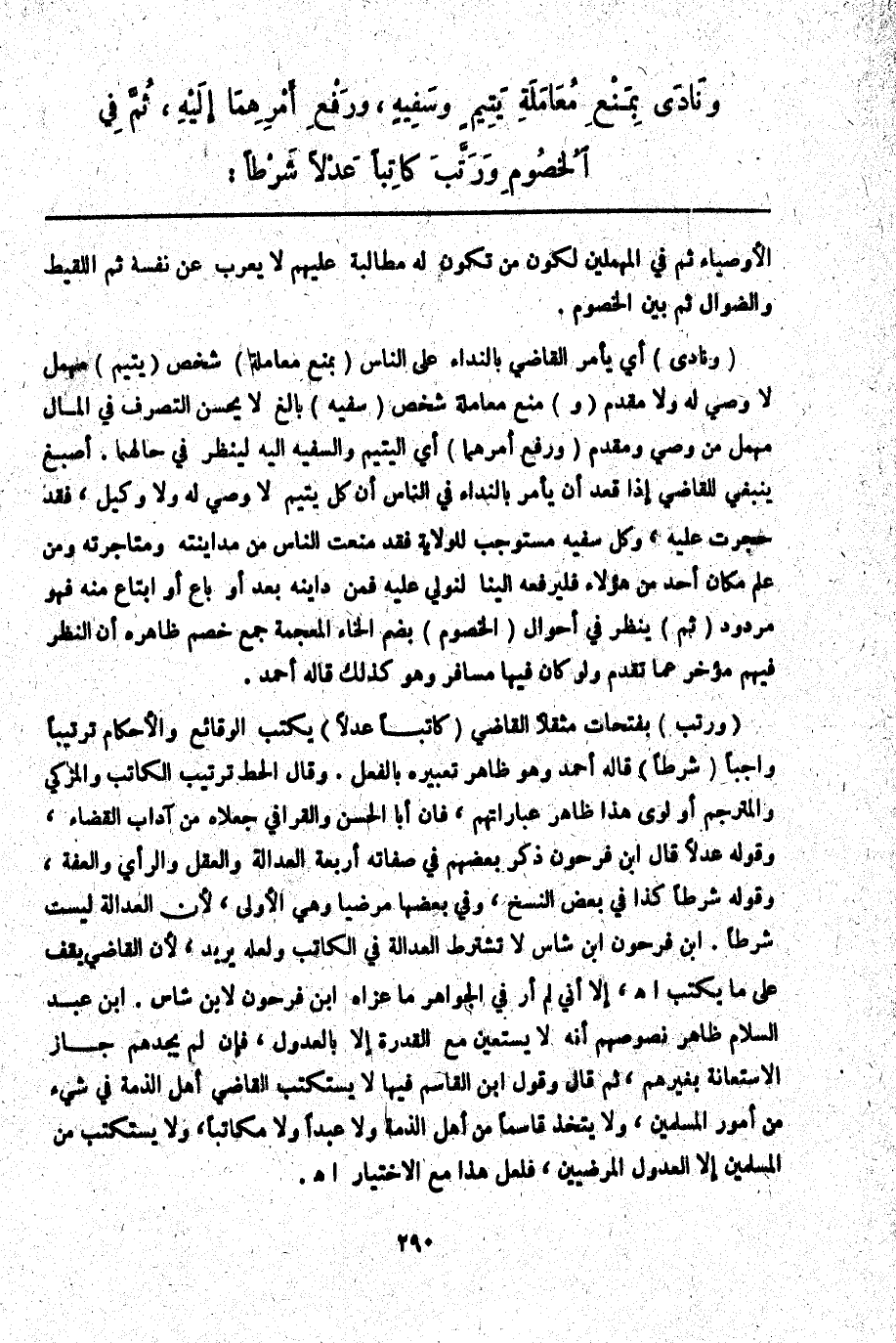 وَنَادَى بِمَنْعِ مُعَامَلَةِ يَتِيمٍ وَسَفِيهٍ، وَرَفْعِ أَمْرَهُمَا إلَيْهِ، ثُمَّ فِي الْخُصُومِ وَرَتَّبَ كَاتِبًا عَدْلًا شَرْطًا: