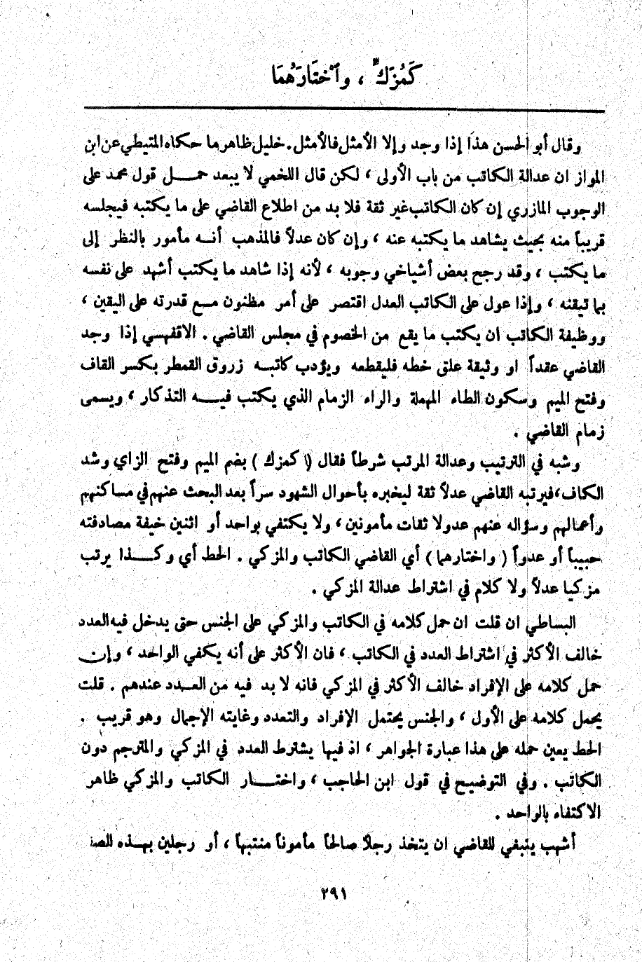 الْبِسَاطِيُّ إنْ قُلْت إنَّ حَمْلَ كَلَامِهِ فِي الْكَاتِبِ وَالْمُزَكِّي عَلَى الْجِنْسِ حَتَّى يَدْخُلَ فِيهِ الْعَدَدُ خَالَفَ الْأَكْثَرَ فِي اشْتِرَاطِ الْعَدَدِ فِي الْكَاتِبِ، فَإِنَّ الْأَكْثَرَ عَلَى أَنَّهُ يَكْفِي الْوَاحِدُ، وَإِنْ حُمِلَ كَلَامُهُ عَلَى الْإِفْرَادِ خَالَفَ الْأَكْثَرَ فِي الْمُزَكِّي فَإِنَّهُ لَا بُدَّ مَعَهُ مِنْ الْعَدَدِ عِنْدَ هُمْ. قُلْت يُحْمَلُ كَلَامُهُ عَلَى الْأَوَّلِ، وَالْجِنْسُ يَحْتَمِلُ الْإِفْرَادَ وَالتَّعَدُّدَ وَغَايَتُهُ الْإِجْمَالُ وَهُوَ قَرِيبٌ. الْحَطّ يُعَيِّنُ حَمْلَهُ عَلَى هَذَا عِبَارَةُ الْجَوَاهِرِ، إذْ فِيهَا يُشْتَرَطُ الْعَدَدُ فِي الْمُزَكِّي وَالْمُتَرْجِمِ دُونَ الْكَاتِبِ. وَفِي التَّوْضِيحِ فِي قَوْلِ ابْنِ الْحَاجِبِ وَاخْتَارَ الْكَاتِبُ وَالْمُزَكِّي ظَاهِرُهُ الِاكْتِفَاءُ بِالْوَاحِدِ.