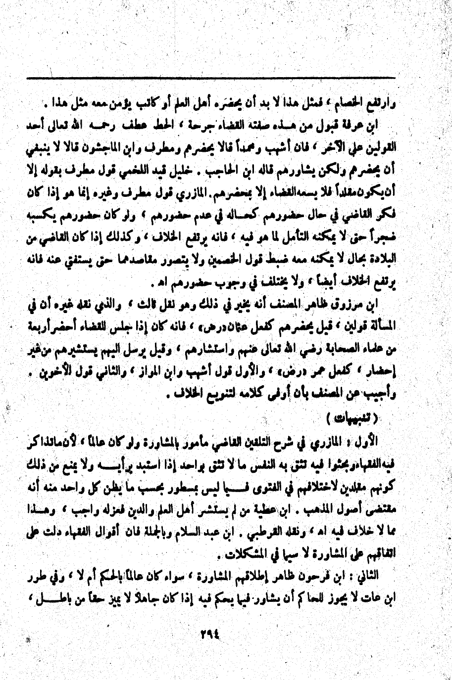 الْأَوَّلُ: الْمَازِرِيُّ فِي شَرْحِ التَّلْقِينِ الْقَاضِي مَأْمُورٌ بِالْمُشَاوَرَةِ وَلَوْ كَانَ عَالِمًا لِأَنَّ مَا تَذَاكَرَ فِيهِ الْفُقَهَاءُ وَبَحَثُوا فِيهِ تَثِقُ بِهِ النَّفْسُ مَا لَا تَثِقُ بِوَاحِدٍ إذَا اسْتَبَدَّ بِرَأْيِهِ وَلَا يَمْنَعُ مِنْ ذَلِكَ كَوْنُهُمْ مُقَلِّدِينَ لِاخْتِلَافِهِمْ فِي الْفَتْوَى فِيمَا لَيْسَ بِمَسْطُورٍ بِحَسَبِ مَا يَظُنُّ وَاحِدٌ مِنْهُ أَنَّهُ مُقْتَضَى أُصُولِ الْمَذْهَبِ. ابْنُ عَطِيَّةَ مَنْ لَمْ يَسْتَشِرْ أَهْلَ الْعِلْمِ وَالدِّينِ فَعَزْلُهُ وَاجِبٌ، وَهَذَا مِمَّا لَا خِلَافَ فِيهِ. اهـ. وَنَقَلَهُ الْقُرْطُبِيُّ. ابْنُ عَبْدِ السَّلَامِ وَبِالْجُمْلَةِ فَإِنَّ أَقْوَالَ الْفُقَهَاءِ دَلَّتْ عَلَى اتِّفَاقِهِمْ عَلَى الْمُشَاوَرَةِ لَا سِيَّمَا فِي الْمُشْكِلَاتِ.