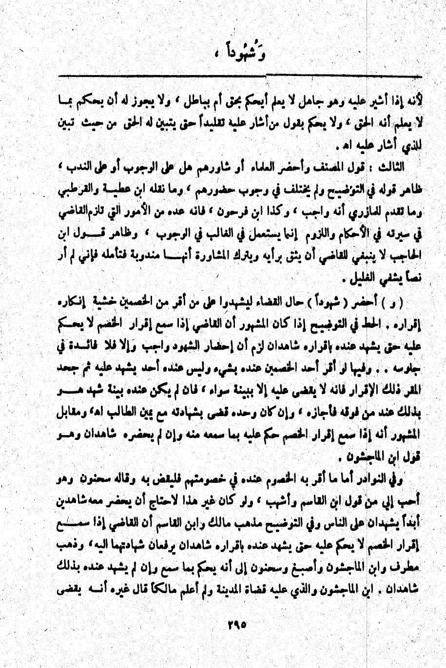 الثَّالِثُ: قَوْلُ الْمُصَنِّفِ وَأَحْضَرَ الْعُلَمَاءَ أَوْ شَاوَرَهُمْ هَلْ عَلَى الْوُجُوبِ أَوْ عَلَى النَّدْبِ، ظَاهِرُ قَوْلِهِ فِي التَّوْضِيحِ وَلَمْ يَخْتَلِفْ فِي وُجُوبِ حُضُورِهِمْ، وَمَا نَقَلَهُ ابْنُ عَطِيَّةَ وَالْقُرْطُبِيُّ وَمَا تَقَدَّمَ لِلْمَازِرِيِّ أَنَّهُ وَاجِبٌ، وَكَذَا ابْنُ فَرْحُونٍ، فَإِنَّهُ عَدَّهُ مِنْ الْأُمُورِ الَّتِي تَلْزَمُ الْقَاضِي فِي سِيرَتِهِ فِي الْأَحْكَامِ وَاللُّزُومِ أَنَّهَا يُسْتَعْمَلُ فِي الْغَالِبِ فِي الْوُجُوبِ، وَظَاهِرُ قَوْلِ ابْنِ الْحَاجِبِ لَا يَنْبَغِي لِلْقَاضِي أَنْ يَثِقَ بِرَأْيِهِ وَيَتْرُكَ الْمُشَاوَرَةَ أَنَّهَا مَنْدُوبَةٌ فَتَأَمَّلْهُ فَإِنِّي لَمْ أَرَ نَصًّا يَشْفِي الْغَلِيلَ.