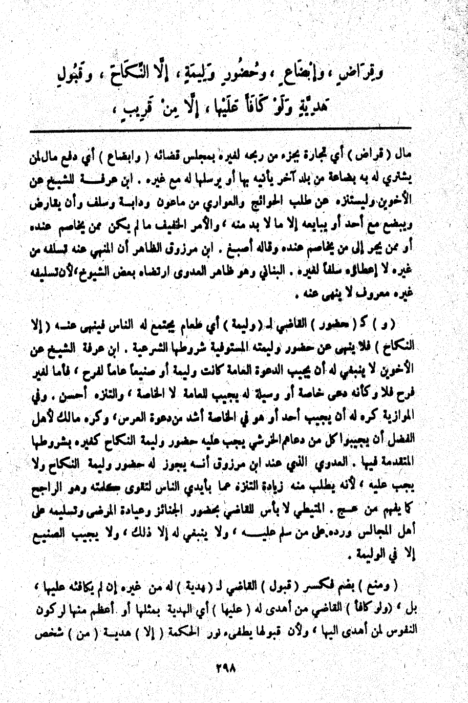 (وَ) كَ (حُضُورِ) الْقَاضِي لِ (وَلِيمَةٍ) أَيْ طَعَامٍ يَجْتَمِعُ لَهُ النَّاسُ فَيُنْهَى عَنْهُ (إلَّا النِّكَاحَ) فَلَا يُنْهَى عَنْ حُضُورِ وَلِيمَتِهِ الْمُسْتَوْفِيَةِ شُرُوطَهَا الشَّرْعِيَّةَ. ابْنُ عَرَفَةَ الشَّيْخُ عَنْ الْأَخَوَيْنِ لَا يَنْبَغِي لَهُ أَنْ يُجِيبَ الدَّعْوَةَ الْعَامَّةَ كَانَتْ وَلِيمَةً أَوْ صَنِيعًا عَامًّا لِفَرَحٍ، فَأَمَّا لِغَيْرِ فَرَحٍ فَلَا وَكَأَنَّهُ دُعِيَ خَاصَّةً أَوْ وَسِيلَةً لَهُ يُجِيبُ لِلْعَامَّةِ لَا الْخَاصَّةِ، وَالتَّنَزُّهُ أَحْسَنُ. وَفِي الْمَوَّازِيَّةِ كُرِهَ لَهُ أَنْ يُجِيبَ أَحَدًا أَوْ هُوَ فِي الْخَاصَّةِ أَشَدُّ مِنْ دَعْوَةِ الْعُرْسِ، وَكَرِهَ مَالِكٌ لِأَهْلِ الْفَضْلِ أَنْ يُجِيبُوا كُلَّ مَنْ دَعَاهُمْ. الْخَرَشِيُّ يَجِبُ عَلَيْهِ حُضُورُ وَلِيمَةِ النِّكَاحِ كَغَيْرِهِ بِشُرُوطِهَا الْمُتَقَدِّمَةِ فِيهَا. الْعَدَوِيُّ الَّذِي عِنْدَ ابْنِ مَرْزُوقٍ أَنَّهُ يَجُوزُ لَهُ حُضُورُ وَلِيمَةِ النِّكَاحِ وَلَا يَجِبُ عَلَيْهِ، لِأَنَّهُ يُطْلَبُ مِنْهُ زِيَادَةُ التَّنَزُّهِ عَمَّا بِأَيْدِي النَّاسِي لِتَقْوَى كَلِمَتُهُ وَهُوَ الرَّاجِحُ كَمَا يُفْهَمُ مِنْ عج. الْمُتَيْطِيُّ لَا بَأْسَ لِلْقَاضِي بِحُضُورِ الْجَنَائِزِ وَعِيَادَةِ الْمَرْضَى وَتَسْلِيمِهِ عَلَى أَهْلِ الْمَجَالِسِ وَرَدِّهِ عَلَى مَنْ سَلَّمَ عَلَيْهِ، وَلَا يَنْبَغِي لَهُ إلَّا ذَلِكَ، وَلَا يُجِيبُ الصَّنِيعَ إلَّا فِي الْوَلِيمَةِ.