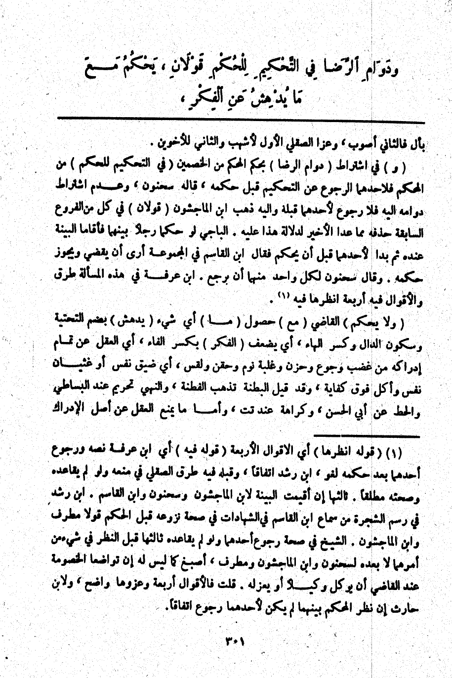 (وَ) فِي اشْتِرَاطِ (دَوَامِ الرِّضَا) بِحُكْمِ الْمُحَكَّمِ مِنْ الْخَصْمَيْنِ (فِي التَّحْكِيمِ لِلْحُكْمِ) مِنْ الْمُحَكَّمِ فَلِأَحَدِهِمَا الرُّجُوعُ عَنْ التَّحْكِيمِ قَبْلَ حُكْمِهِ، قَالَهُ سَحْنُونٌ، وَعَدَمُ اشْتِرَاطِ دَوَامِهِ إلَيْهِ فَلَا رُجُوعَ لِأَحَدِهِمَا قَبْلَهُ وَإِلَيْهِ ذَهَبَ ابْنُ الْمَاجِشُونِ (قَوْلَانِ) فِي كُلٍّ مِنْ الْفُرُوعِ السَّابِقَةِ حَذَفَهُ مِمَّا عَدَا الْأَخِيرَ لِدَلَالَةِ هَذَا عَلَيْهِ. الْبَاجِيَّ لَوْ حَكَّمَا رَجُلًا بَيْنَهُمَا فَأَقَامَا الْبَيِّنَةَ عِنْدَهُ ثُمَّ بَدَا لِأَحَدِهِمَا قَبْلَ أَنْ يَحْكُمَ فَقَالَ ابْنُ الْقَاسِمِ فِي الْمَجْمُوعَةِ أَرَى أَنْ يَقْضِيَ، وَيَجُوزُ حُكْمُهُ. وَقَالَ سَحْنُونٌ لِكُلِّ وَاحِدٍ مِنْهُمَا أَنْ يَرْجِعَ. ابْنُ عَرَفَةَ فِي هَذِهِ الْمَسْأَلَةِ طُرُقٌ وَالْأَقْوَالُ فِيهِ أَرْبَعَةٌ اُنْظُرْهَا فِيهِ.