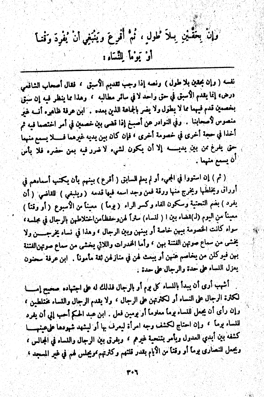 (ثُمَّ) إنْ اسْتَوَوْا فِي الْمَجِيءِ أَوْ لَمْ يُعْلَمْ السَّابِقُ (أَقْرَعَ) بَيْنَهُمْ بِأَنْ يَكْتُبَ أَسْمَاءَهُمْ فِي أَوْرَاقٍ وَيَخْلِطَهَا وَيُخْرِجَ مِنْهَا وَرَقَةً فَمَنْ وَجَدَ اسْمَهُ فِيهَا قَدَّمَهُ (وَيَنْبَغِي) لِلْقَاضِي (أَنْ يُفْرِدَ) بِضَمِّ التَّحْتِيَّةِ وَسُكُونِ الْفَاءِ وَكَسْرِ الرَّاءِ (يَوْمًا) مُعَيَّنًا مِنْ الْأُسْبُوعِ (أَوْ وَقْتًا) مُعَيَّنًا مِنْ الْيَوْمِ (لِ) قَضَاءٍ بَيْنَ (االنِّسَاءِ) سَتْرًا لَهُنَّ وَحِفْظًا مِنْ اخْتِلَاطِهِنَّ بِالرِّجَالِ فِي مَجْلِسِهِ، سَوَاءٌ كَانَتْ الْخُصُومَةُ بَيْنَهُنَّ خَاصَّةً أَوْ بَيْنَهُنَّ وَبَيْنَ الرِّجَالِ، وَهَذَا فِي نِسَاءٍ يَخْرُجْنَ وَلَا يُخْشَى مِنْ سَمَاعِ صَوْتِهِنَّ الْفِتْنَةُ بِهِنَّ، وَأَمَّا الْمُخَدَّرَاتُ وَاَللَّاتِي يُخْشَى مِنْ سَمَاعِ صَوْتِهِنَّ الْفِتْنَةُ بِهِنَّ فَيُوَكِّلْنَ مِنْ يُخَاصِمُ عَنْهُنَّ أَوْ يَبْعَثُ لَهُنَّ فِي مَنَازِلِهِنَّ ثِقَةً مَأْمُونًا. ابْنُ عَرَفَةَ سَحْنُونٌ يَعْزِلُ النِّسَاءَ عَلَى حِدَةٍ وَالرِّجَالَ عَلَى حِدَةٍ.