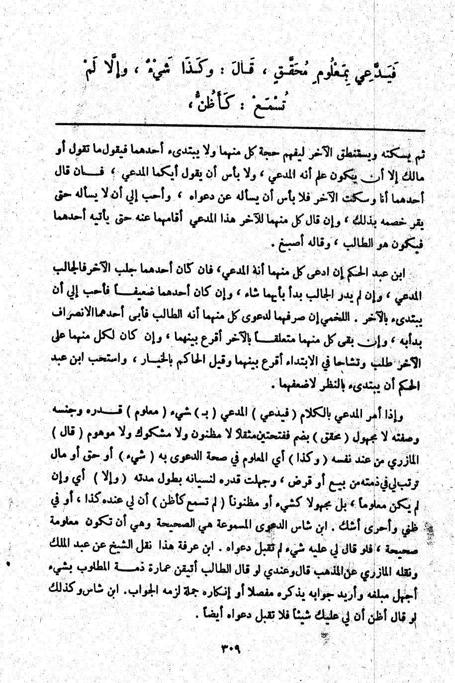 وَإِذَا أَمَرَ الْمُدَّعِي بِالْكَلَامِ (فَيَدَّعِي) الْمُدَّعِي (ب) شَيْءٍ (مَعْلُومٍ) قَدْرُهُ وَجِنْسُهُ وَصِفَتُهُ لَا مَجْهُولٍ (مُحَقَّقٍ) بِضَمٍّ فَفَتْحَتَيْنِ مُثَقَّلًا لَا مَظْنُونٍ وَلَا مَشْكُوكٍ وَلَا مَوْهُومٍ (قَالَ) الْمَازِرِيُّ مِنْ عِنْدِ نَفْسِهِ (وَكَذَا) أَيْ الْمَعْلُومُ فِي صِحَّةِ الدَّعْوَى بِهِ (شَيْءٌ) أَوْ حَقٌّ أَوْ مَالٌ تَرَتَّبَ لِي فِي ذِمَّتِهِ مِنْ بَيْعٍ أَوْ قَرْضٍ، وَجَهِلْت قَدْرَهُ لِنِسْيَانِهِ بِطُولِ مُدَّتِهِ (وَإِلَّا) أَيْ وَإِنْ لَمْ يَكُنْ مَعْلُومًا، بَلْ مَجْهُولًا كَشَيْءٍ أَوْ مَظْنُونًا (لَمْ تُسْمَعْ كَأَظُنُّ) أَنَّ لِي عِنْدَهُ كَذَا، أَوْ فِي ظَنِّي وَأَحْرَى أَشُكُّ. ابْنُ شَاسٍ الدَّعْوَى الْمَسْمُوعَةُ هِيَ الصَّحِيحَةُ وَهِيَ أَنْ تَكُونَ مَعْلُومَةً صَحِيحَةً، فَلَوْ قَالَ لِي عَلَيْهِ شَيْءٌ لَمْ تُقْبَلْ دَعْوَاهُ. ابْنُ عَرَفَةَ هَذَا نَقْلُ الشَّيْخِ عَنْ عَبْدِ الْمَلِكِ وَنَقَلَهُ الْمَازِرِيُّ عَنْ الْمَذْهَبِ قَالَ وَعِنْدِي لَوْ قَالَ الطَّالِبُ أَتَيَقَّنُ عِمَارَةَ ذِمَّةِ الْمَطْلُوبِ بِشَيْءٍ أَجْهَلُ مَبْلَغَهُ وَأُرِيدُ جَوَابَهُ يَذْكُرُهُ مُفَصَّلًا أَوْ إنْكَارُهُ جُمْلَةً لَزِمَهُ الْجَوَابُ. ابْنُ شَاسٍ وَكَذَلِكَ لَوْ قَالَ أَظُنُّ أَنَّ لِي عَلَيْك شَيْئًا فَلَا تُقْبَلُ دَعْوَاهُ أَيْضًا.