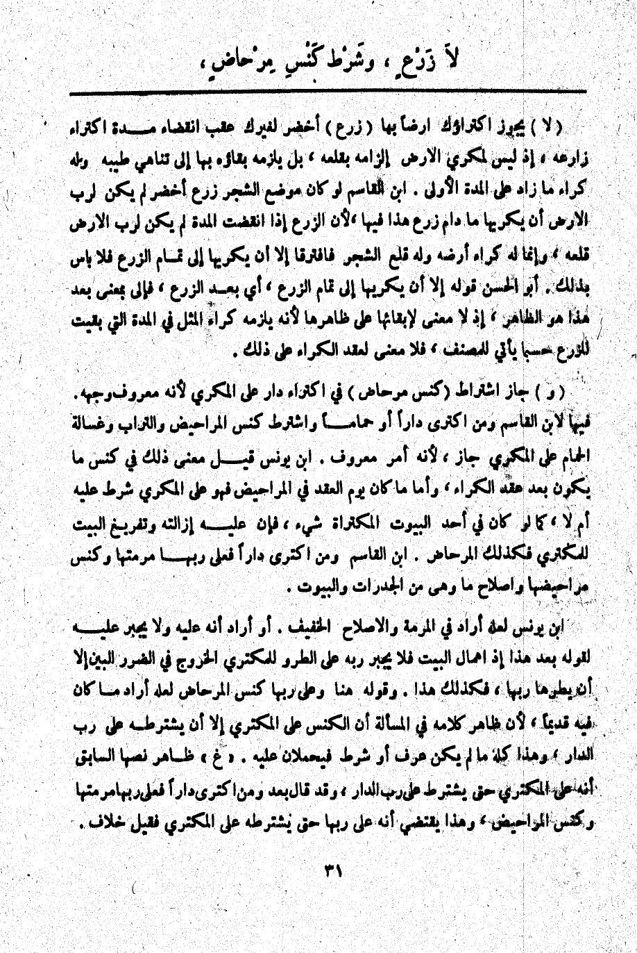 فِيهَا لِابْنِ الْقَاسِمِ وَمَنْ اكْتَرَى دَارًا أَوْ حَمَّامًا وَاشْتَرَطَ كَنْسَ الْمَرَاحِيضِ وَالتُّرَابِ وَغُسَالَةَ الْحَمَّامِ عَلَى الْمُكْرِي جَازَ؛ لِأَنَّهُ أَمْرٌ مَعْرُوفٌ. ابْنُ يُونُسَ قِيلَ مَعْنَى ذَلِكَ فِي كَنْسِ مَا يَكُونُ بَعْدَ عَقْدِ الْكِرَاءِ، وَأَمَّا مَا كَانَ يَوْمَ الْعَقْدِ فِي الْمَرَاحِيضِ فَهُوَ عَلَى الْمُكْرِي شُرِطَ عَلَيْهِ أَمْ لَا، كَمَا لَوْ كَانَ فِي أَحَدِ الْبُيُوتِ الْمُكْتَرَاةِ شَيْءٌ، فَإِنَّ عَلَيْهِ إزَالَتَهُ وَتَفْرِيغَ الْبَيْتِ لِلْمُكْتَرِي فَكَذَلِكَ الْمِرْحَاضُ. ابْنُ الْقَاسِمِ وَمَنْ اكْتَرَى دَارًا فَعَلَى رَبِّهَا مَرَمَّتُهَا وَكَنْسُ مَرَاحِيضِهَا وَإِصْلَاحُ مَا وَهِيَ مِنْ الْجُدْرَانِ وَالْبُيُوتِ.