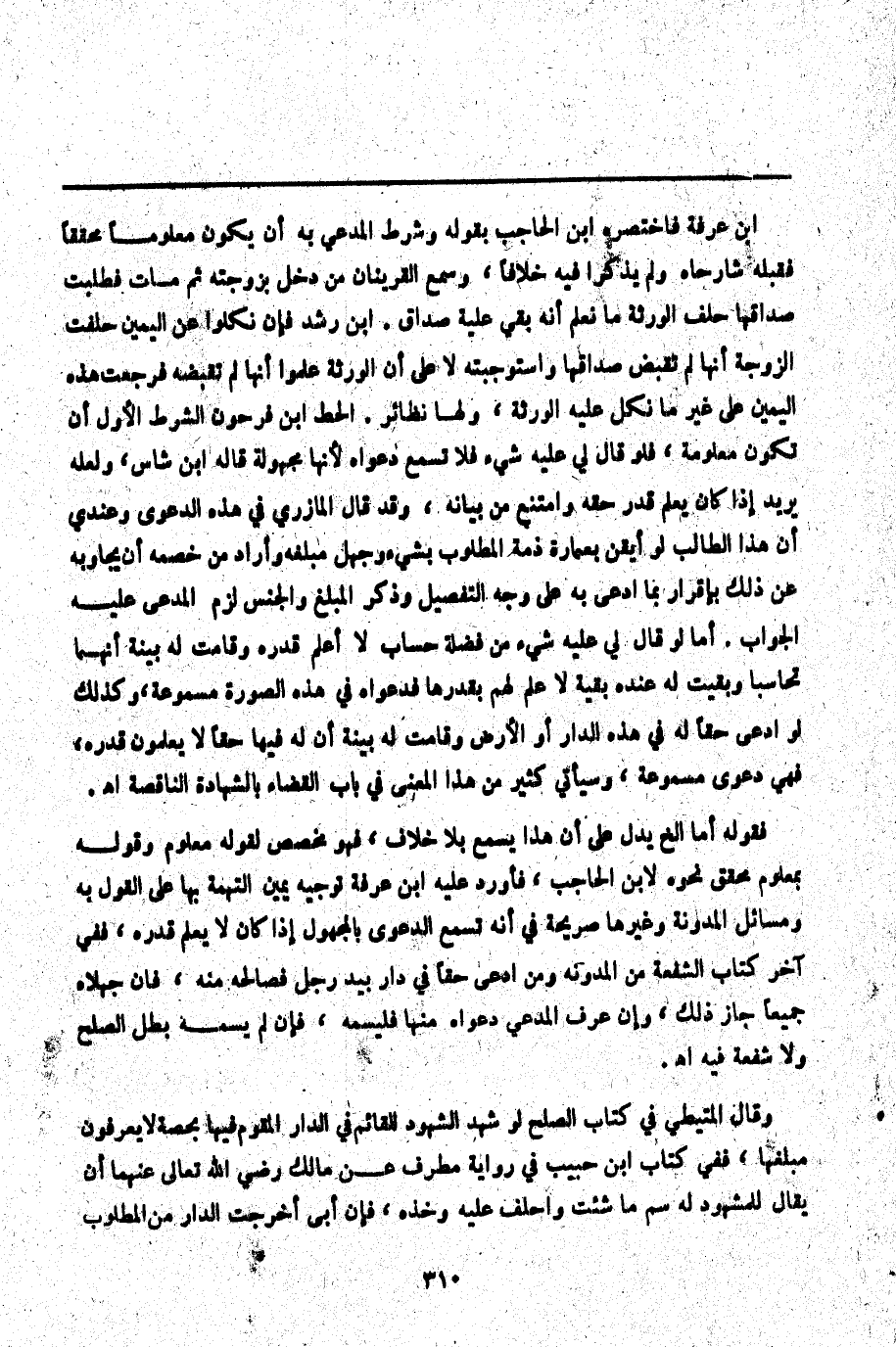 ـــــــــــــــــــــــــــــQابْنُ عَرَفَةَ فَاخْتَصَرَهُ ابْنُ الْحَاجِبِ بِقَوْلِهِ وَشَرَطَ الْمُدَّعَى بِهِ أَنْ يَكُونَ مَعْلُومًا مُحَقَّقًا فَقَبِلَهُ شَارِحَاهُ وَلَمْ يَذْكُرَا فِيهِ خِلَافًا، وَسَمِعَ الْقَرِينَانِ مَنْ دَخَلَ بِزَوْجَتِهِ ثُمَّ مَاتَ فَطَلَبَتْ صَدَاقَهَا حَلَفَ الْوَرَثَةُ مَا نَعْلَمُ أَنَّهُ بَقِيَ عَلَيْهِ صَدَاقٌ. ابْنُ رُشْدٍ فَإِنْ نَكَلُوا عَنْ الْيَمِينِ حَلَفَتْ الزَّوْجَةُ أَنَّهَا لَمْ تَقْبِضْ صَدَاقَهَا وَاسْتَوْجَبَتْهُ لَا عَلَى أَنَّ الْوَرَثَةَ عَلِمُوا أَنَّهَا لَمْ تَقْبِضْهُ فَرَجَعَتْ هَذِهِ الْيَمِينُ عَلَى غَيْرِ مَا نَكَلَ عَلَيْهِ الْوَرَثَةُ، وَلَهَا نَظَائِرُ. الْحَطّ ابْنُ فَرْحُونٍ الشَّرْطُ الْأَوَّلُ أَنْ تَكُونَ مَعْلُومَةً، فَلَوْ قَالَ لِي عَلَيْهِ شَيْءٌ فَلَا تُسْمَعُ دَعْوَاهُ لِأَنَّهَا مَجْهُولَةٌ قَالَهُ ابْنُ شَاسٍ، وَلَعَلَّهُ يُرِيدُ إذَا كَانَ يَعْلَمُ قَدْرَ حَقِّهِ وَامْتَنَعَ مِنْ بَيَانِهِ، وَقَدْ قَالَ الْمَازِرِيُّ فِي هَذِهِ الدَّعْوَى وَعِنْدِي أَنَّ هَذَا الطَّالِبَ لَوْ أَيْقَنَ بِعِمَارَةِ ذِمَّةِ الْمَطْلُوبِ بِشَيْءٍ وَجَهِلَ مَبْلَغَهُ وَأَرَادَ مِنْ خَصْمِهِ أَنْ يُجَاوِبَهُ عَنْ ذَلِكَ بِإِقْرَارٍ بِمَا ادَّعَى بِهِ عَلَى وَجْهِ التَّفْصِيلِ وَذَكَرَ الْمَبْلَغَ وَالْجِنْسَ لَزِمَ الْمُدَّعَى عَلَيْهِ الْجَوَابُ. أَمَّا لَوْ قَالَ لِي عَلَيْهِ شَيْءٌ مِنْ فَضْلَةِ حِسَابٍ لَا أَعْلَمُ قَدْرَهُ وَقَامَتْ لَهُ بَيِّنَةٌ أَنَّهُمَا تَحَاسَبَا وَبَقِيَتْ لَهُ عِنْدَهُ بَقِيَّةٌ لَا عِلْمَ لَهُمْ بِقَدْرِهَا فَدَعْوَاهُ فِي هَذِهِ الصُّورَةِ مَسْمُوعَةٌ، وَكَذَلِكَ لَوْ ادَّعَى حَقًّا لَهُ فِي هَذِهِ الدَّارِ أَوْ الْأَرْضِ وَقَامَتْ لَهُ بَيِّنَةٌ أَنَّ لَهُ فِيهَا حَقًّا لَا يَعْلَمُونَ قَدْرَهُ، فَهِيَ دَعْوَى مَسْمُوعَةٌ وَسَيَأْتِي كَثِيرٌ مِنْ هَذَا الْمَعْنَى فِي بَابِ الْقَضَاءِ بِالشَّهَادَةِ النَّاقِصَةِ اهـ.