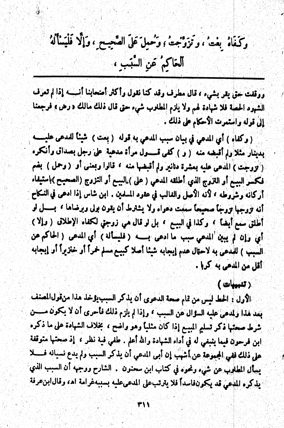 طفي فِيهِ نَظَرٌ، إذْ صِحَّتُهَا مُتَوَقِّفَةٌ عَلَى ذَلِكَ فَفِي الْمَجْمُوعَةِ عَنْ أَشْهَبَ إنْ أَبَى الْمُدَّعِي أَنْ يَذْكُرَ السَّبَبَ وَلَمْ يَدَّعِ نِسْيَانَهُ فَلَا يُسْأَلُ الْمَطْلُوبُ عَنْ شَيْءٍ وَنَحْوِهِ فِي كِتَابِ ابْنِ سَحْنُونٍ. الشَّارِحُ وَوَجْهُهُ أَنَّ السَّبَبَ الَّذِي يَذْكُرُهُ الْمُدَّعِي قَدْ يَكُونُ فَاسِدًا فَلَا يَتَرَتَّبُ عَلَى الْمُدَّعَى عَلَيْهِ بِسَبَبِهِ غَرَامَةٌ. اهـ. وَقَالَ ابْنُ عَرَفَةَ