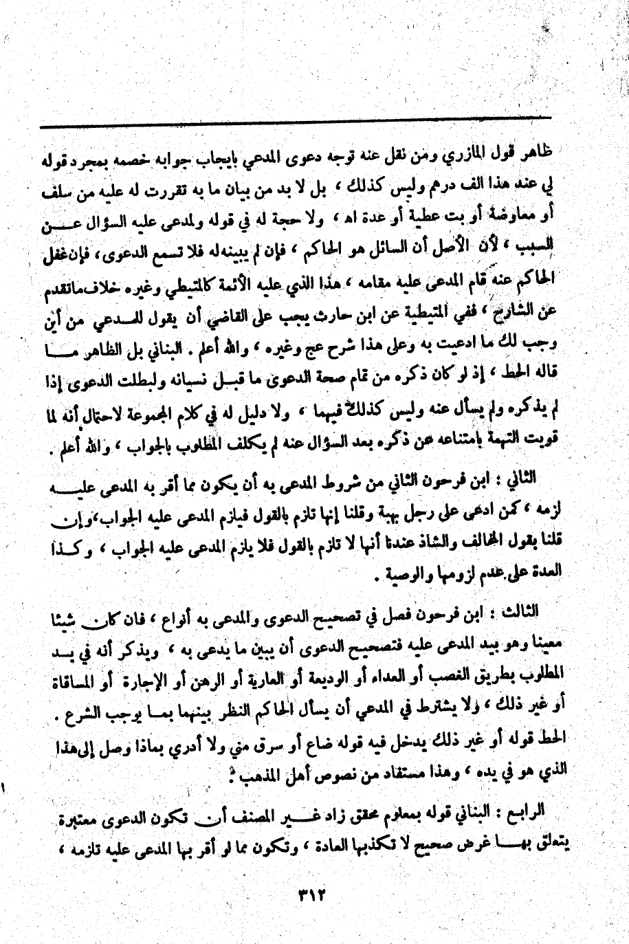 الثَّالِثُ: ابْنُ فَرْحُونٍ فَصْلٌ فِي تَصْحِيحِ الدَّعْوَى وَالْمُدَّعَى بِهِ أَنْوَاعٌ، فَإِنْ كَانَ شَيْئًا مُعَيَّنًا وَهُوَ بِيَدِ الْمُدَّعَى عَلَيْهِ فَتَصْحِيحُ الدَّعْوَى أَنْ يُبَيِّنَ مَا يَدَّعِي بِهِ، وَيَذْكُرَ أَنَّهُ فِي يَدِ الْمَطْلُوبِ بِطَرِيقِ الْغَصْبِ أَوْ الْعَدَاءِ أَوْ الْوَدِيعَةِ أَوْ الْعَارِيَّةِ أَوْ الرَّهْنِ أَوْ الْإِجَارَةِ أَوْ الْمُسَاقَاةِ أَوْ غَيْرِ ذَلِكَ، وَلَا يُشْتَرَطُ فِي الْمُدَّعِي أَنْ يَسْأَلَ الْحَاكِمَ النَّظَرَ بَيْنَهُمَا بِمَا يُوجِبُ الشَّرْعَ. الْحَطّ قَوْلُهُ أَوْ غَيْرُ ذَلِكَ يَدْخُلُ فِيهِ قَوْلُهُ ضَاعَ أَوْ سُرِقَ مِنِّي وَلَا أَدْرِي بِمَاذَا وَصَلَ إلَى هَذَا الَّذِي هُوَ فِي يَدِهِ، وَهَذَا مُسْتَفَادٌ مِنْ نُصُوصِ أَهْلِ الْمَذْهَبِ.