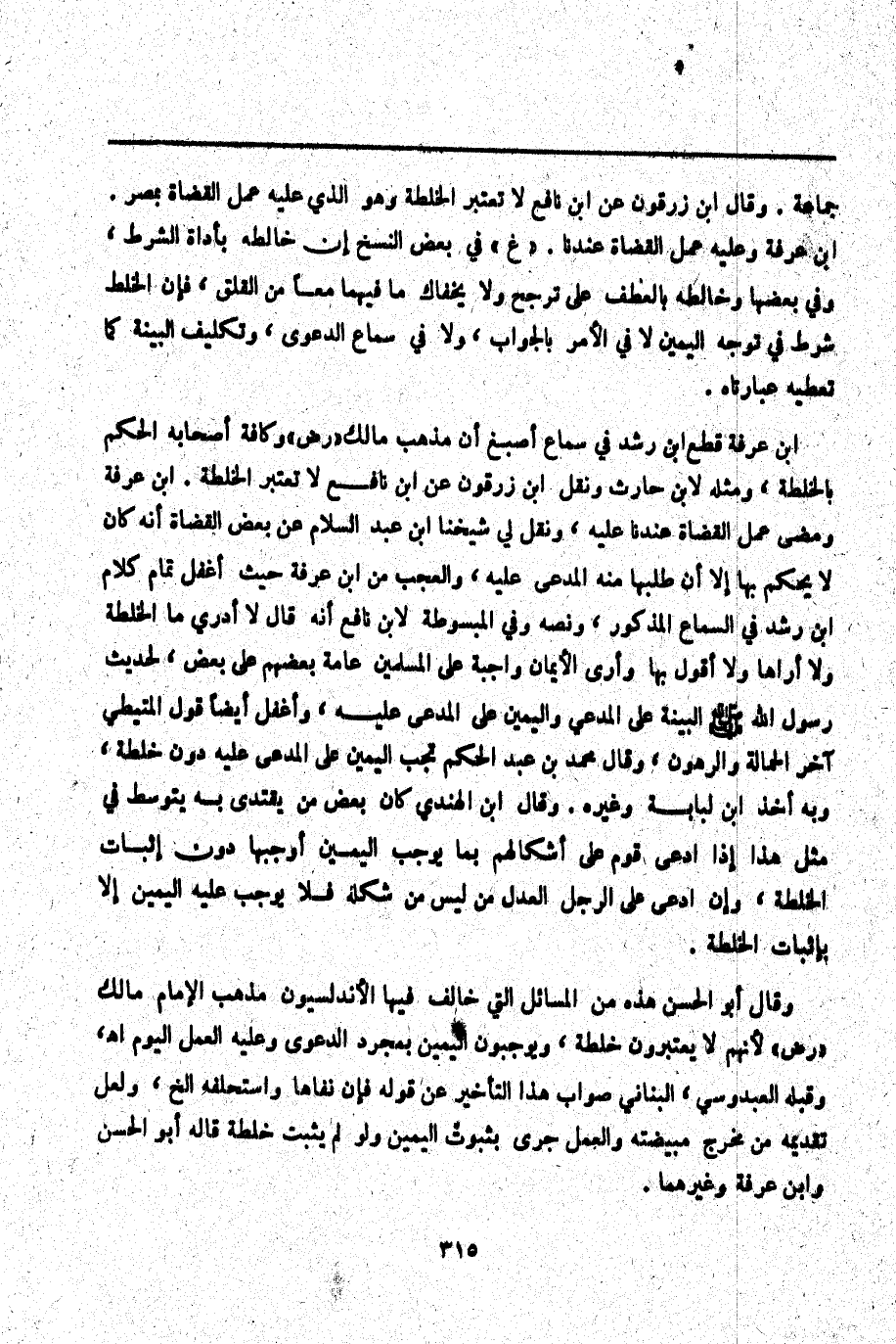 ابْنُ عَرَفَةَ قَطَعَ ابْنُ رُشْدٍ فِي سَمَاعِ أَصْبَغَ أَنَّ مَذْهَبَ مَالِكٍ - رَضِيَ اللَّهُ عَنْهُ - وَكَافَّةِ أَصْحَابِهِ الْحُكْمُ بِالْخُلْطَةِ، وَمِثْلُهُ لِابْنِ حَارِثٍ وَنَقَلَ ابْنُ زَرْقُونٍ عَنْ ابْنِ نَافِعٍ لَا تُعْتَبَرُ الْخُلْطَةُ. ابْنُ عَرَفَةَ وَمَضَى عَمَلُ الْقُضَاةِ عِنْدَنَا عَلَيْهِ، وَنَقَلَ لِي شَيْخُنَا ابْنُ عَبْدِ السَّلَامِ عَنْ بَعْضِ الْقُضَاةِ أَنَّهُ كَانَ لَا يَحْكُمُ بِهَا إلَّا إنْ طَلَبَهَا مِنْهُ الْمُدَّعَى عَلَيْهِ، وَالْعَجَبُ مِنْ ابْنِ عَرَفَةَ حَيْثُ أَغْفَلَ تَمَامَ كَلَامِ ابْنِ رُشْدٍ فِي السَّمَاعِ الْمَذْكُورِ، وَنَصُّهُ وَفِي الْمَبْسُوطَةِ لِابْنِ نَافِعٍ أَنَّهُ قَالَ لَا أَدْرِي مَا الْخُلْطَةُ وَلَا أَرَاهَا وَلَا أَقُولُ بِهَا وَأَرَى الْأَيْمَانَ وَاجِبَةً عَلَى الْمُسْلِمِينَ عَامَّةً بَعْضِهِمْ عَلَى بَعْضٍ، لِحَدِيثِ رَسُولِ اللَّهِ - صَلَّى اللَّهُ عَلَيْهِ وَسَلَّمَ - «الْبَيِّنَةُ عَلَى الْمُدَّعِي وَالْيَمِينُ عَلَى الْمُدَّعَى عَلَيْهِ» ، وَأَغْفَلَ أَيْضًا قَوْلَ الْمُتَيْطِيِّ آخِرَ الْحَمَالَةِ وَالرُّهُونِ، وَقَالَ مُحَمَّدُ بْنُ عَبْدِ الْحَكَمِ تَجِبُ الْيَمِينُ عَلَى الْمُدَّعَى عَلَيْهِ دُونَ خُلْطَةٍ، وَبِهِ أَخَذَ ابْنُ لُبَابَةَ وَغَيْرُهُ. وَقَالَ ابْنُ الْهِنْدِيِّ إنَّ بَعْضَ مَنْ يُقْتَدَى بِهِ يَتَوَسَّطُ فِي مِثْلِ هَذَا إذَا ادَّعَى قَوْمٌ عَلَى أَشْكَالِهِمْ بِمَا يُوجِبُ الْيَمِينَ أَوْجَبَهَا دُونَ إثْبَاتِ الْخُلْطَةِ، وَإِنْ ادَّعَى عَلَى الرَّجُلِ الْعَدْلِ مَنْ لَيْسَ مِنْ شَكْلِهِ فَلَا يُوجِبُ عَلَيْهِ الْيَمِينَ إلَّا بِإِثْبَاتِ الْخُلْطَةِ.