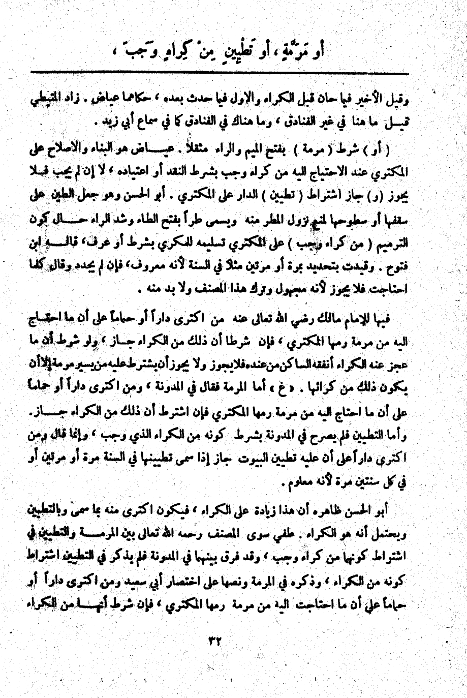 فِيهَا لِلْإِمَامِ مَالِكٍ - رَضِيَ اللَّهُ تَعَالَى عَنْهُ - مَنْ اكْتَرَى دَارًا أَوْ حَمَّامًا عَلَى أَنَّ مَا احْتَاجَ إلَيْهِ مِنْ مَرَمَّةٍ رَمَّهَا الْمُكْتَرِي، فَإِنْ شَرَطَا أَنَّ ذَلِكَ مِنْ الْكِرَاءِ جَازَ، وَلَوْ شَرَطَ أَنَّ مَا عَجَزَ عَنْهُ الْكِرَاءُ أَنْفَقَهُ السَّاكِنُ مِنْ عِنْدِهِ فَلَا يَجُوزُ، وَلَا يَجُوزُ أَنْ يَشْتَرِطَ عَلَيْهِ مِنْ يَسِيرِ مَرَمَّةٍ إلَّا أَنْ يَكُونَ ذَلِكَ مِنْ كِرَائِهَا. " غ " أَمَّا الْمَرَمَّةُ فَقَالَ فِي الْمُدَوَّنَةِ: وَمَنْ اكْتَرَى دَارًا أَوْ حَمَّامًا عَلَى أَنَّ مَا احْتَاجَ إلَيْهِ مِنْ مَرَمَّةٍ رَمَّهَا الْمُكْتَرِي فَإِنْ اشْتَرَطَ أَنَّ ذَلِكَ مِنْ الْكِرَاءِ جَازَ.
