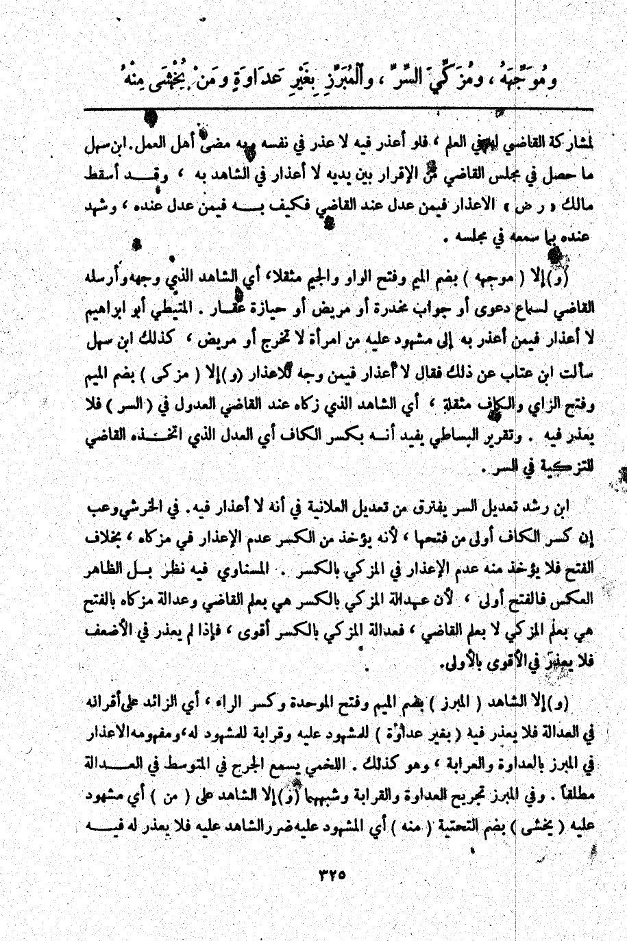 (وَ) إلَّا (مُوَجَّهَهُ) بِضَمِّ الْمِيمِ وَفَتْحِ الْوَاوِ وَالْجِيمِ مُثَقَّلًا، أَيْ الشَّاهِدَ الَّذِي وَجَّهَهُ وَأَرْسَلَهُ الْقَاضِي لِسَمَاعِ دَعْوًى أَوْ جَوَابِ مُخَدَّرَةٍ أَوْ مَرِيضٍ أَوْ حِيَازَةِ عَقَارٍ. الْمُتَيْطِيُّ أَبُو إبْرَاهِيمَ لَا إعْذَارَ فِيمَنْ أَعْذَرَ بِهِ إلَى مَشْهُودٍ عَلَيْهِ مِنْ امْرَأَةٍ لَا تَخْرُجُ أَوْ مَرِيضٍ، كَذَلِكَ ابْنُ سَهْلٍ سَأَلْت ابْنَ عَتَّابٍ عَنْ ذَلِكَ فَقَالَ لَا إعْذَارَ فِيمَنْ وَجَّهَ لِلْإِعْذَارِ (وَ) إلَّا (مُزَكَّى) بِضَمِّ الْمِيمِ وَفَتْحِ الزَّايِ وَالْكَافِ مُثَقَّلَةً، أَيْ الشَّاهِدَ الَّذِي زَكَّاهُ عِنْدَ الْقَاضِي الْعُدُولُ فِي (السِّرِّ) فَلَا يُعْذَرُ فِيهِ. وَتَقْرِيرُ الْبِسَاطِيِّ يُفِيدُ أَنَّهُ بِكَسْرِ الْكَافِ أَيْ الْعَدْلَ الَّذِي اتَّخَذَهُ الْقَاضِي لِلتَّزْكِيَةِ فِي لِلسِّرِّ.
