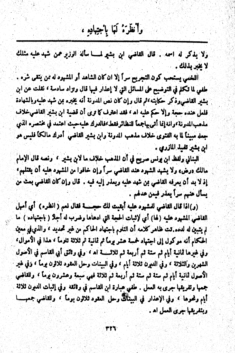 (وَ) إذَا قَالَ الْقَاضِي لِلْمَشْهُودِ عَلَيْهِ أَبَقِيَتْ لَك حُجَّةٌ فَقَالَ نَعَمْ (أَنْظَرَهُ) أَيْ أَمْهَلَ الْقَاضِي الْمَشْهُودَ عَلَيْهِ (لَهَا) أَيْ لِإِثْبَاتِ الْحُجَّةِ الَّتِي ادَّعَاهَا وَضَرَبَ لَهُ أَجَلًا (بِاجْتِهَادِهِ) مَا لَمْ يَتَبَيَّنْ لَهُ لَدَدُهُ. تت ظَاهِرُ كَلَامِهِ أَنَّ التَّلَوُّمَ بِاجْتِهَادِ الْحَاكِمِ مِنْ غَيْرِ تَحْدِيدٍ، وَاَلَّذِي فِي مُعِينِ الْحُكَّامِ أَنَّهُ مَوْكُولٌ إلَى اجْتِهَادٍ خَمْسَةَ عَشَرَ يَوْمًا ثُمَّ ثَمَانِيَةً ثُمَّ ثَلَاثَةً تَلَوُّمًا، هَذَا فِي الْأَمْوَالِ، وَفِي غَيْرِهَا ثَمَانِيَةُ أَيَّامٍ ثُمَّ سِتَّةٌ ثُمَّ أَرْبَعَةٌ ثُمَّ ثَلَاثَةٌ. اهـ. وَفِي وَثَائِقِ أَبِي الْقَاسِمِ فِي الْأُصُولِ الشَّهْرَيْنِ وَالثَّلَاثَةَ، وَفِي الدُّيُونِ ثَلَاثَةُ أَيَّامٍ، وَفِي الْبَيِّنَاتِ وَحَلِّ الْعُقُودِ ثَلَاثُونَ يَوْمًا، وَفِي غَيْرِ الْأُصُولِ ثَمَانِيَةُ أَيَّامٍ ثُمَّ سِتَّةٌ ثُمَّ سِتَّةٌ ثُمَّ أَرْبَعَةٌ ثُمَّ ثَلَاثَةٌ فَهِيَ سَبْعَةٌ وَعِشْرُونَ يَوْمًا، وَلِلْقَاضِي جَمْعُهَا وَتَفْرِيقُهَا جَرَى بِهِ الْعَمَلُ. طفي عِبَارَةُ ابْنِ الْقَاسِمِ فِي وَثَائِقِهِ وَفِي إثْبَاتِ الدُّيُونِ ثَلَاثَةُ أَيَّامٍ وَنَحْوِهَا، وَفِي الْإِعْذَارِ فِي الْبَيِّنَاتِ وَحَلِّ الْعُقُودِ ثَلَاثُونَ يَوْمًا، وَلِلْقَاضِي جَمْعُهَا وَبِتَفْرِيقِهَا جَرَى الْعَمَلُ اهـ.