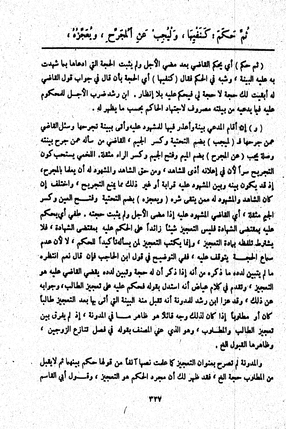 ثُمَّ حَكَمَ: كَنَفَيْهَا، وَلْيُجِبْ عَنْ الْمُجَرِّحِ، وَيُعَجِّزُهُ