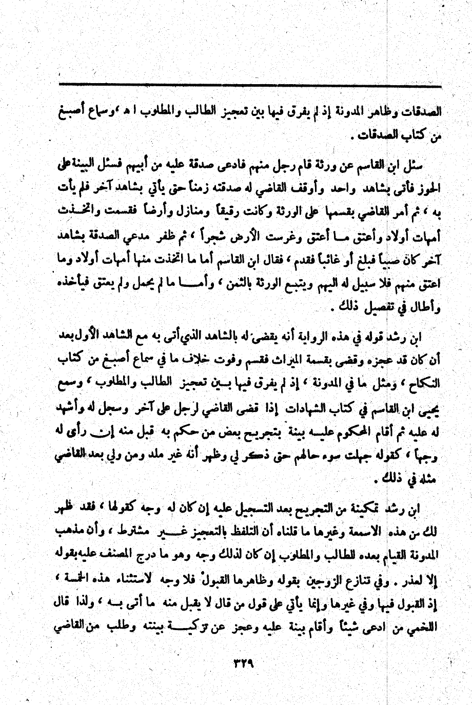 سُئِلَ ابْنُ الْقَاسِمِ عَنْ وَرَثَةٍ قَامَ رَجُلٌ مِنْهُمْ فَادَّعَى صَدَقَةً عَلَيْهِ مِنْ أَبِيهِمْ فَسُئِلَ الْبَيِّنَةَ عَلَى الْحَوْزِ فَأَتَى بِشَاهِدٍ وَاحِدٍ وَأَوْقَفَ الْقَاضِي لَهُ صَدَقَتَهُ زَمَنًا حَتَّى يَأْتِيَ بِشَاهِدٍ آخَرَ فَلَمْ يَأْتِ بِهِ، ثُمَّ أَمَرَ الْقَاضِي بِقَسْمِهَا عَلَى الْوَرَثَةِ وَكَانَتْ رَقِيقًا وَمَنَازِلَ وَأَرْضًا فَقُسِمَتْ وَاُتُّخِذَتْ أُمَّهَاتُ أَوْلَادٍ وَأُعْتِقَ مَا أُعْتِقَ وَغُرِسَتْ الْأَرْضُ شَجَرًا، ثُمَّ ظَفِرَ مُدَّعِي الصَّدَقَةِ بِشَاهِدٍ آخَرَ كَانَ صَبِيًّا فَبَلَغَ أَوْ غَائِبًا فَقَدِمَ، فَقَالَ ابْنُ الْقَاسِمِ أَمَّا مَا اُتُّخِذَتْ مِنْهَا أُمَّهَاتُ أَوْلَادٍ وَمَا أُعْتِقَ مِنْهُمْ فَلَا سَبِيلَ لَهُ إلَيْهِمْ وَيَتْبَعُ الْوَرَثَةَ بِالثَّمَنِ، وَأَمَّا مَا لَمْ يُحْمَلْ وَلَمْ يُعْتَقْ فَيَأْخُذُهُ وَأَطَالَ فِي تَفْصِيلِ ذَلِكَ.