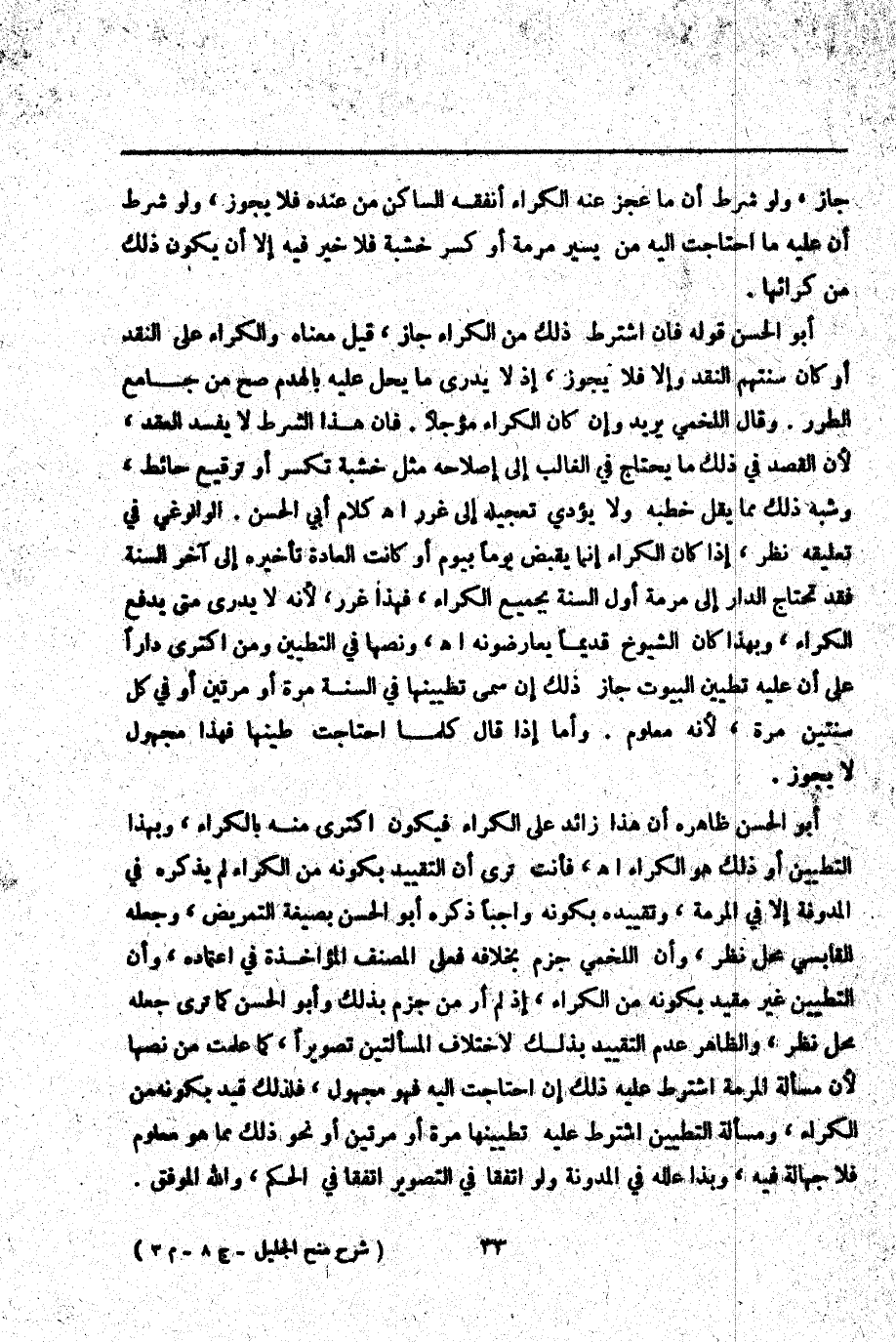 أَبُو الْحَسَنِ ظَاهِرُهُ: أَنَّ هَذَا زَائِدٌ عَلَى الْكِرَاءِ فَيَكُونُ اكْتَرَى مِنْهُ بِالْكِرَاءِ، وَبِهَذَا التَّطْيِينِ أَوْ ذَلِكَ هُوَ الْكِرَاءُ. اهـ فَأَنْتَ تَرَى أَنَّ التَّقْيِيدَ بِكَوْنِهِ مِنْ الْكِرَاءِ لَمْ يَذْكُرْهُ فِي الْمُدَوَّنَةِ إلَّا فِي الْمَرَمَّةِ، وَتَقْيِيدُهُ بِكَوْنِهِ وَاجِبًا ذَكَرَهُ أَبُو الْحَسَنِ بِصِيغَةِ التَّمْرِيضِ، وَجَعَلَهُ الْقَابِسِيُّ مَحَلَّ نَظَرٍ، وَأَنَّ اللَّخْمِيَّ جَزَمَ بِخِلَافِهِ فَعَلَى الْمُصَنِّفِ الْمُؤَاخَذَةُ فِي اعْتِمَادِهِ، وَأَنَّ التَّطْيِينَ غَيْرُ مُقَيَّدٍ بِكَوْنِهِ مِنْ الْكِرَاءِ، إذْ لَمْ أَرَ مَنْ جَزَمَ بِذَلِكَ وَأَبُو الْحَسَنِ كَمَا تَرَى جَعَلَهُ مَحَلَّ نَظَرٍ، وَالظَّاهِرُ عَدَمُ التَّقْيِيدِ بِذَلِكَ لِاخْتِلَافِ الْمَسْأَلَتَيْنِ تَصْوِيرًا، كَمَا عَلِمْت مِنْ نَصِّهَا؛ لِأَنَّ مَسْأَلَةَ الْمَرَمَّةِ اشْتَرَطَ عَلَيْهِ ذَلِكَ إنْ احْتَاجَتْ إلَيْهِ فَهُوَ مَجْهُولٌ، فَلِذَلِكَ قُيِّدَ بِكَوْنِهِ مِنْ الْكِرَاءِ، وَمَسْأَلَةُ التَّطْيِينِ اشْتَرَطَ عَلَيْهِ تَطْيِينَهَا مَرَّةً أَوْ مَرَّتَيْنِ أَوْ نَحْوَ ذَلِكَ مِمَّا هُوَ مَعْلُومٌ فَلَا جَهَالَةَ فِيهِ، وَبِذَا عَلَّلَهُ فِي الْمُدَوَّنَةِ وَلَوْ اتَّفَقَا فِي التَّصْوِيرِ اتَّفَقَا فِي الْحُكْمِ، وَاَللَّهُ الْمُوَفِّقُ.