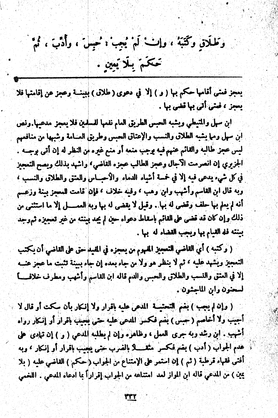 (وَإِنْ لَمْ يُجِبْ) بِضَمِّ التَّحْتِيَّةِ الْمُدَّعَى عَلَيْهِ بِإِقْرَارٍ وَلَا إنْكَارٍ بِأَنْ سَكَتَ أَوْ قَالَ لَا أُجِيبُ وَلَا أُخَاصِمُ (حُبِسَ) بِضَمٍّ فَكَسْرٍ الْمُدَّعَى عَلَيْهِ حَتَّى يُجِيبَ بِإِقْرَارٍ أَوْ إنْكَارٍ رَوَاهُ أَشْهَبُ. ابْنُ رُشْدٍ وَبِهِ جَرَى الْعَمَلُ، وَظَاهِرُهُ وَإِنْ لَمْ يَطْلُبْهُ الْمُدَّعِي (وَ) إنْ تَمَادَى عَلَى عَدَمِ الْجَوَابِ (أُدِّبَ) بِضَمٍّ فَكَسْرٍ مُثَقَّلًا بِالضَّرْبِ حَتَّى يُجِيبَ بِإِقْرَارٍ أَوْ إنْكَارٍ، وَبِهِ أَفْتَى فُقَهَاءُ قُرْطُبَةَ (ثُمَّ) إنْ اسْتَمَرَّ عَلَى الِامْتِنَاعِ مِنْ الْجَوَابِ (حَكَمَ) الْقَاضِي عَلَيْهِ (بِلَا يَمِينٍ) مِنْ الْمُدَّعِي قَالَهُ ابْنُ الْمَوَّازِ لِعَدَمِ امْتِنَاعِهِ مِنْ الْجَوَابِ إقْرَارًا بِمَا ادَّعَاهُ الْمُدَّعِي. اللَّخْمِيُّ
