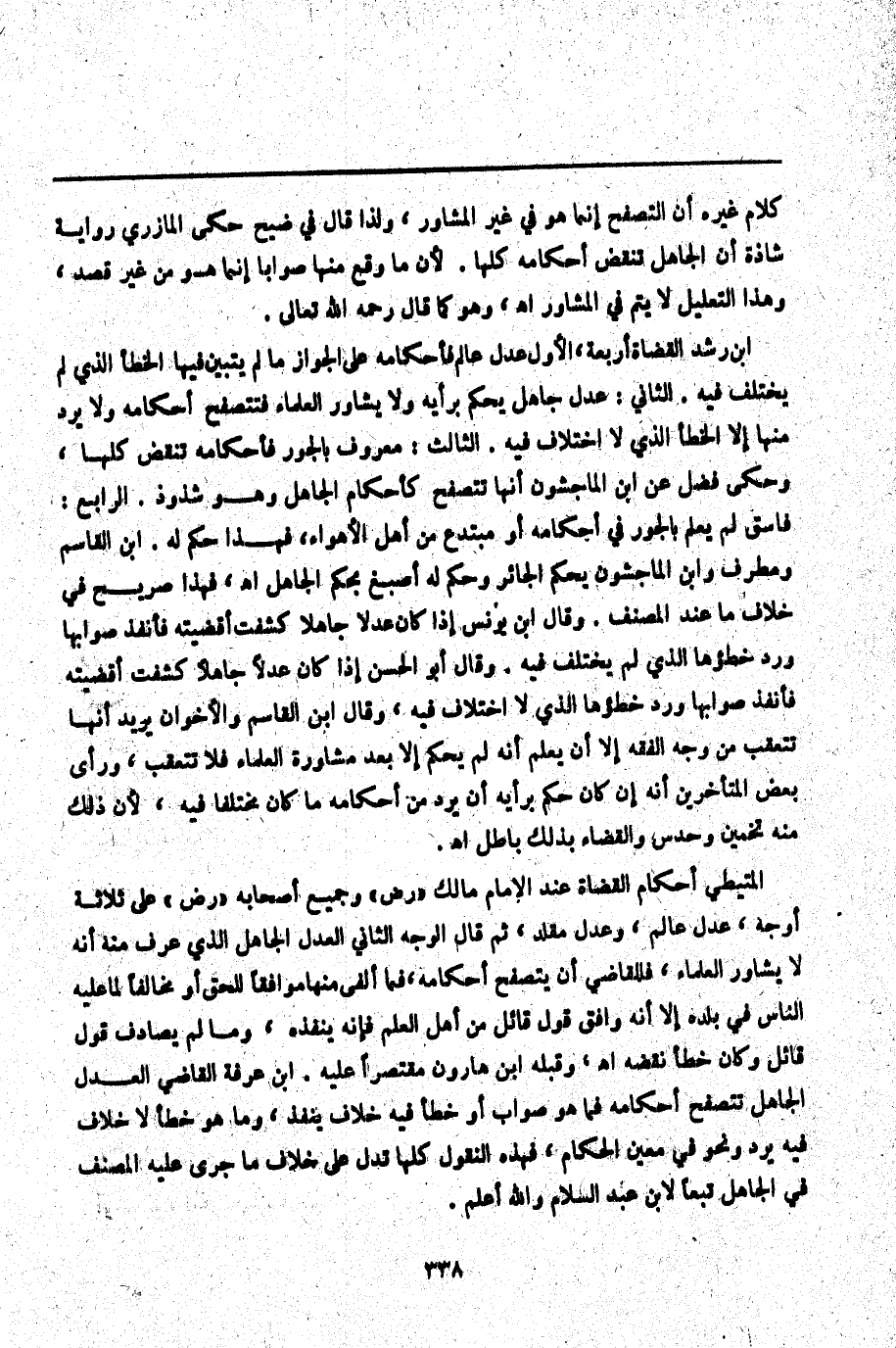 الْمُتَيْطِيُّ أَحْكَامُ الْقُضَاةِ عِنْدَ الْإِمَامِ مَالِكٍ - رَضِيَ اللَّهُ عَنْهُ - وَجَمِيعِ أَصْحَابِهِ - رَضِيَ اللَّهُ تَعَالَى عَنْهُمْ - عَلَى ثَلَاثَةِ أَوْجُهٍ: عَدْلٍ عَالِمٍ، وَعَدْلٍ مُقَلِّدٍ، ثُمَّ قَالَ الْوَجْهُ الثَّانِي الْعَدْلُ الْجَاهِلُ الَّذِي عُرِفَ مِنْهُ أَنَّهُ لَا يُشَاوِرُ الْعُلَمَاءَ، فَلِلْقَاضِي أَنْ يَتَصَفَّحَ أَحْكَامَهُ، فَمَا أَلْفَى مِنْهَا مُوَافِقًا لِلْحَقِّ أَوْ مُخَالِفًا لِمَا عَلَيْهِ النَّاسُ فِي بَلَدِهِ إلَّا أَنَّهُ وَافَقَ قَوْلَ قَائِلٍ مِنْ أَهْلِ الْعِلْمِ فَإِنَّهُ يُنْفِذُهُ، وَمَا لَمْ يُصَادِفْ قَوْلَ قَائِلٍ وَكَانَ خَطَأً نَقَضَهُ. اهـ. وَقَبِلَهُ ابْنُ هَارُونَ مُقْتَصِرًا عَلَيْهِ. ابْنُ عَرَفَةَ الْقَاضِي الْعَدْلُ الْجَاهِلُ تُتَصَفَّحُ أَحْكَامُهُ فَمَا هُوَ صَوَابٌ أَوْ خَطَأٌ فِيهِ خِلَافٌ يَنْفُذُ، وَمَا هُوَ خَطَأٌ لَا خِلَافَ فِيهِ يُرَدُّ وَنَحْوُهُ فِي مُعِينِ الْحُكَّامِ، فَهَذِهِ النُّقُولُ كُلُّهَا تَدُلُّ عَلَى خِلَافِ مَا جَرَى عَلَيْهِ الْمُصَنِّفُ فِي الْجَاهِلِ تَبَعًا لِابْنِ عَبْدِ السَّلَامِ وَاَللَّهُ أَعْلَمُ.