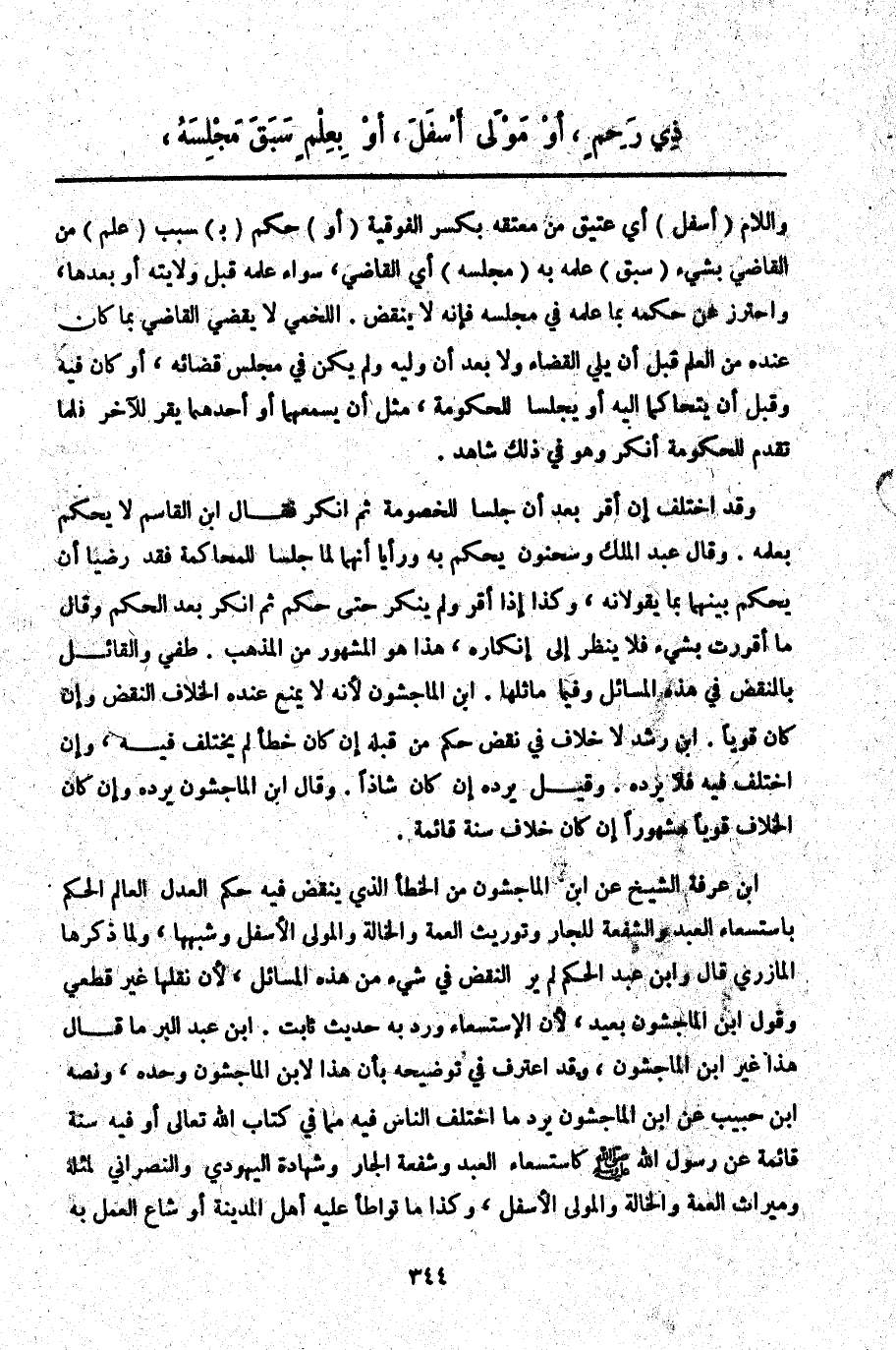 ابْنُ عَرَفَةَ الشَّيْخُ عَنْ ابْنِ الْمَاجِشُونِ مِنْ الْخَطَأِ الَّذِي يُنْقَضُ فِيهِ حُكْمُ الْعَدْلِ الْعَالِمِ الْحُكْمُ بِاسْتِسْعَاءِ الْعَبْدِ وَالشُّفْعَةِ لِلْجَارِ وَتَوْرِيثِ الْعَمَّةِ وَالْخَالَةِ وَالْمَوْلَى الْأَسْفَلِ وَشِبْهِهَا، وَلَمَّا ذَكَرَهَا الْمَازِرِيُّ قَالَ وَابْنُ عَبْدِ الْحَكَمِ لَمْ يَرَ النَّقْضَ فِي شَيْءٍ مِنْ هَذِهِ الْمَسَائِلِ لِأَنَّ نَقْلَهَا غَيْرُ قَطْعِيٍّ وَقَوْلُ ابْنِ الْمَاجِشُونِ بَعِيدٌ لِأَنَّ الِاسْتِسْعَاءَ وَرَدَ بِهِ حَدِيثٌ ثَابِتٌ. ابْنُ عَبْدِ الْبَرِّ مَا قَالَ هَذَا غَيْرُ ابْنِ الْمَاجِشُونِ، وَقَدْ اعْتَرَفَ فِي تَوْضِيحِهِ بِأَنَّ هَذَا لِابْنِ الْمَاجِشُونِ وَحْدَهُ، وَنَصُّ ابْنُ حَبِيبٍ عَنْ ابْنِ الْمَاجِشُونِ يَرُدُّ مَا اخْتَلَفَ النَّاسُ فِيهِ مِمَّا فِي كِتَابِ اللَّهِ تَعَالَى أَوْ فِيهِ سُنَّةٌ قَائِمَةٌ عَنْ رَسُولِ اللَّهِ - صَلَّى اللَّهُ عَلَيْهِ وَسَلَّمَ - كَاسْتِسْعَاءِ الْعَبْدِ وَشُفْعَةِ الْجَارِ وَشَهَادَةِ الْيَهُودِيِّ وَالنَّصْرَانِيِّ لِمِثْلِهِ وَمِيرَاثِ الْعَمَّةِ وَالْخَالَةِ وَالْمَوْلَى الْأَسْفَلِ، وَكَذَا مَا تَوَاطَأَ عَلَيْهِ أَهْلُ الْمَدِينَةِ أَوْ شَاعَ الْعَمَلُ بِهِ