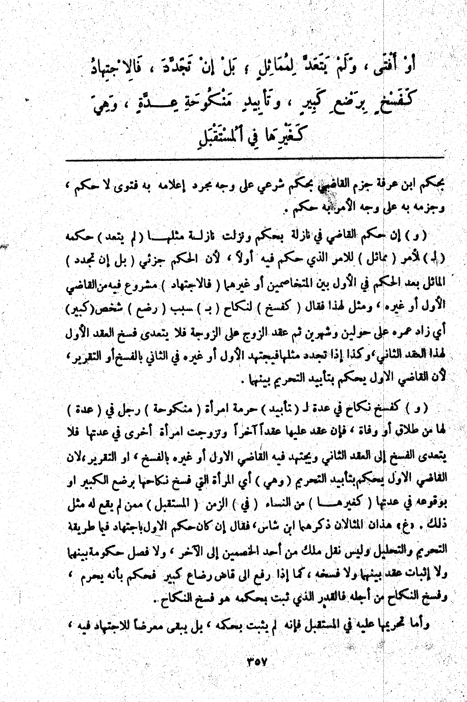 ـــــــــــــــــــــــــــــQبِحُكْمٍ ابْنِ عَرَفَةَ جَزْمُ الْقَاضِي بِحُكْمٍ شَرْعِيٍّ عَلَى وَجْهٍ مِنْ مُجَرَّدِ إعْلَامِهِ بِهِ فَتْوَى لَا حُكْمٌ، وَجَزْمُهُ بِهِ عَلَى وَجْهِ الْأَمْرِ بِهِ حُكْمٌ.