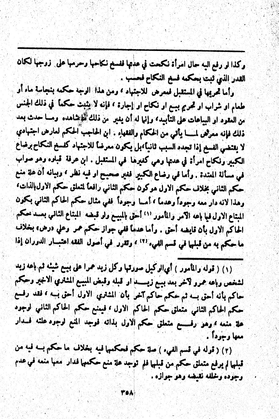 وَأَمَّا تَحْرِيمُهَا فِي الْمُسْتَقْبَلِ فَمُعَرَّضٌ لِلِاجْتِهَادِ، وَمِنْ هَذَا الْوَجْهِ حُكْمُهُ بِنَجَاسَةِ مَاءٍ أَوْ طَعَامٍ أَوْ شَرَابٍ أَوْ تَحْرِيمِ بَيْعٍ أَوْ نِكَاحٍ أَوْ إجَارَةٍ، فَإِنَّهُ لَا يَثْبُتُ حُكْمًا فِي ذَلِكَ الْجِنْسِ مِنْ الْعُقُودِ أَوْ الْبَيَّاعَاتِ عَلَى التَّأْبِيدِ، وَإِنَّمَا لَهُ أَنْ يُغَيِّرَ مِنْ ذَلِكَ مَا شَاهَدَهُ وَمَا حَدَثَ بَعْدَ ذَلِكَ فَإِنَّهُ مُعَرَّضٌ لِمَا يَأْتِي مِنْ الْحُكَّامِ وَالْفُقَهَاءِ. ابْنُ الْحَاجِبِ الْحُكْمُ لِعَارِضٍ اجْتِهَادِيٍّ لَا يَقْتَضِي الْفَسْخَ إذَا تَحَدَّدَ السَّبَبُ ثَانِيًا، بَلْ يَكُونُ مُعَرَّضًا لِلِاجْتِهَادِ كَفَسْخِ النِّكَاحِ بِرَضَاعِ الْكَبِيرِ وَنِكَاحِ امْرَأَةٍ فِي عِدَّتِهَا وَهِيَ كَغَيْرِهَا فِي الْمُسْتَقْبَلِ. ابْنُ عَرَفَةَ قَبِلُوهُ وَهُوَ صَوَابٌ فِي مَسْأَلَةِ الْمُعْتَدَّةِ. وَأَمَّا فِي رَضَاعِ الْكَبِيرِ فَغَيْرُ صَحِيحٍ أَوْ فِيهِ نَظَرٌ، وَبَيَانُهُ أَنَّ عِلَّةَ مَنْعِ حُكْمِ الثَّانِي بِخِلَافِ حُكْمِ الْأَوَّلِ هُوَ كَوْنُ حُكْمِ الثَّانِي رَافِعًا لِمُتَعَلِّقِ حُكْمِ الْأَوَّلِ بِالذَّاتِ، وَهَذَا لِأَنَّهُ دَارَ مَعَهُ وُجُودًا وَعَدَمًا، إمَّا وُجُودًا فَفِي مِثَالِ حُكْمِ الْحَاكِمِ الثَّانِي بِكَوْنِ الْمُبْتَاعِ الْأَوَّلِ فِيمَا بَاعَهُ الْآمِرُ وَالْمَأْمُورُ أَحَقَّ بِالْمَبِيعِ وَلَوْ قَبَضَهُ الْمُبْتَاعُ الثَّانِي بَعْدَ حُكْمِ الْحَاكِمِ الْأَوَّلِ بِأَنَّ قَابِضَهُ أَحَقُّ. وَأَمَّا عَدَمًا فَفِي جَوَازِ حُكْمِ عُمَرَ وَعَلِيٍّ " - رَضِيَ اللَّهُ عَنْهُمَا - " بِخِلَافِ مَا حَكَمَ بِهِ مَنْ قَبْلَهُمَا فِي قِسْمِ الْفَيْءِ، وَتَقَرَّرَ فِي أُصُولِ الْفِقْهِ اعْتِبَارُ الدَّوَرَانِ، إذَا