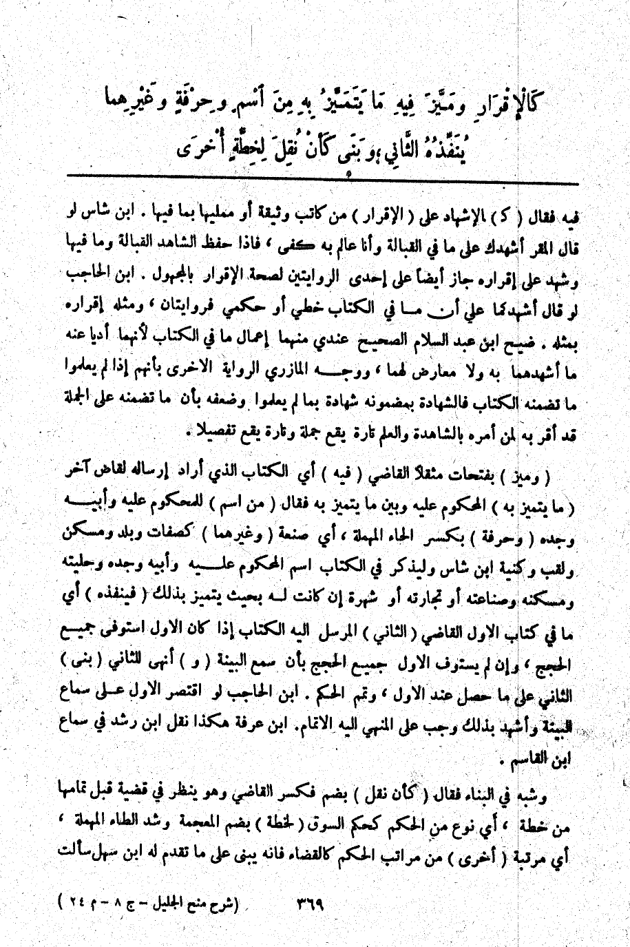 ـــــــــــــــــــــــــــــQفِيهِ فَقَالَ (كَ) الْإِشْهَادِ عَلَى (الْإِقْرَارِ) مِنْ كَاتِبِ وَثِيقَةٍ أَوْ مُمْلِيهَا بِمَا فِيهَا. ابْنُ شَاسٍ لَوْ قَالَ الْمُقِرُّ أُشْهِدُك عَلَى مَا فِي الْقُبَالَةِ وَأَنَا عَالِمٌ بِهِ كَفَى، فَإِذَا حَفِظَ الشَّاهِدُ الْقُبَالَةَ وَمَا فِيهَا وَشَهِدَ عَلَى إقْرَارِهِ جَازَ أَيْضًا عَلَى إحْدَى الرِّوَايَتَيْنِ لِصِحَّةِ الْإِقْرَارِ بِالْمَجْهُولِ. ابْنُ الْحَاجِبِ لَوْ قَالَ أُشْهِدُكُمَا عَلَى أَنَّ مَا فِي الْكِتَابِ خَطِّي أَوْ حُكْمِي فَرِوَايَتَانِ، وَمِثْلُهُ إقْرَارُهُ بِمِثْلِهِ. ضَيْح ابْنُ عَبْدِ السَّلَامِ الصَّحِيحُ عِنْدِي مِنْهُمَا إعْمَالُ مَا فِي الْكِتَابِ لِأَنَّهُمَا أَدَّيَا عَنْهُ مَا أَشْهَدَهُمَا بِهِ وَلَا مُعَارِضَ لَهُمَا، وَوَجَّهَ الْمَازِرِيِّ الرِّوَايَةَ الْأُخْرَى بِأَنَّهُمْ إذَا لَمْ يَعْلَمُوا مَا تَضَمَّنَهُ الْكِتَابُ فَالشَّهَادَةُ بِمَضْمُونِهِ شَهَادَةٌ بِمَا لَمْ يَعْلَمُوا وَضَعَّفَهُ بِأَنَّ مَا تَضَمَّنَهُ عَلَى الْجُمْلَةِ قَدْ أَقَرَّ بِهِ لِمَنْ أَمَرَهُ بِالشَّاهِدَةِ وَالْعِلْمُ تَارَةً يَقَعُ جُمْلَةً وَتَارَةً يَقَعُ تَفْصِيلًا.