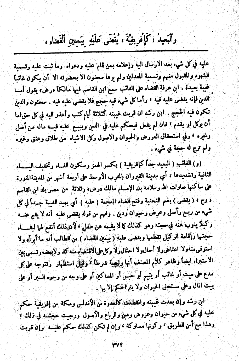 ابْنُ رُشْدٍ وَإِنْ بَعُدَتْ غَيْبَتُهُ وَانْقَطَعَتْ كَالْعَدْوَةِ مِنْ الْأَنْدَلُسِ وَمَكَّةَ مِنْ إفْرِيقِيَّةَ حُكِمَ عَلَيْهِ فِي كُلِّ شَيْءٍ مِنْ حَيَوَانٍ وَعُرُوضٍ وَدَيْنٍ وَالرِّبَاعِ وَالْأُصُولِ وَرُجِيَتْ حُجَّتُهُ فِي ذَلِكَ، وَهَذَا مَعَ أَمْنِ الطَّرِيقِ، وَكَوْنِهَا مَسْلُوكَةً، وَإِنْ لَمْ تَكُنْ كَذَلِكَ حُكِمَ عَلَيْهِ وَإِنْ قَرُبَتْ