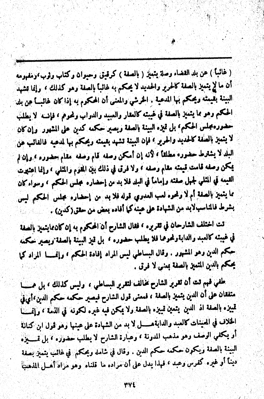 ـــــــــــــــــــــــــــــQغَائِبًا) عَنْ بَلَدِ الْقَضَاءِ وَصِلَةُ يَتَمَيَّزُ (بِالصِّفَةِ) كَرَقِيقٍ وَحَيَوَانٍ وَكِتَابٍ وَثَوْبٍ، وَمَفْهُومُهُ أَنَّ مَا لَا يَتَمَيَّزُ بِالصِّفَةِ كَالْحَرِيرِ وَالْحَدِيدِ لَا يُحْكَمُ بِهِ غَائِبًا بِالصِّفَةِ وَهُوَ كَذَلِكَ، وَإِنَّمَا تَشْهَدُ الْبَيِّنَةُ بِقِيمَتِهِ وَيْحُكُمْ بِهَا الْمُدَّعِيَةُ. الْخَرَشِيُّ وَالْمَعْنَى أَنَّ الْمَحْكُومَ بِهِ إذَا كَانَ غَائِبًا عَنْ بَلَدِ الْحُكْمِ وَهُوَ مِمَّا يَتَمَيَّزُ بِالصِّفَةِ فِي غَيْبَتِهِ كَالْعَقَارِ وَالْعَبِيدِ وَالدَّوَابِّ وَنَحْوِهِمْ، فَإِنَّهُ لَا يُطْلَبُ حُضُورُهُ مَجْلِسَ الْحُكْمِ، بَلْ تُمَيِّزُهُ الْبَيِّنَةُ بِالصِّفَةِ وَيَصِيرُ حُكْمُهُ كَدَيْنٍ عَلَى الْمَشْهُورِ وَإِنْ كَانَ لَا يَتَمَيَّزُ بِالصِّفَةِ كَالْحَدِيدِ وَالْحَرِيرِ، فَإِنَّ الْبَيِّنَةَ تَشْهَدُ بِقِيمَتِهِ وَيْحُكُمْ بِهَا لِمُدَّعِيهِ فَالْغَائِبُ عَنْ الْبَلَدِ لَا يُشْتَرَطُ حُضُورُهُ مُطْلَقًا، لِأَنَّهُ إنْ أَمْكَنَ وَصْفُهُ قَامَ وَصْفُهُ مَقَامَ حُضُورِهِ، وَإِنْ لَمْ يُمْكِنْ وَصْفُهُ قَامَتْ قِيمَتُهُ مَقَامَ وَصْفِهِ، وَلَا فَرْقَ فِي ذَلِكَ بَيْنَ الْمُقَوَّمِ وَالْمِثْلِيِّ، وَإِنَّمَا اُعْتُبِرَتْ الْقِيمَةُ فِي الْمِثْلِيِّ لِجَهْلِ صِفَتِهِ وَإِمَامًا فِي الْبَلَدِ فَلَا بُدَّ مِنْ إحْضَارِهِ مَجْلِسَ الْحُكْمِ، وَسَوَاءٌ كَانَ مِمَّا يَتَمَيَّزُ بِالصِّفَةِ أَمْ لَا وَنَحْوُهُ لعب الْعَدَوِيِّ قَوْلُهُ فَلَا بُدَّ مِنْ إحْضَارِهِ مَجْلِسَ الْحُكْمِ لَيْسَ بِشَرْطٍ فَالْمُنَاسِبُ لَا بُدَّ مِنْ الشَّهَادَةِ عَلَى عَيْنِهِ كَمَا أَفَادَهُ بَعْضُ مَنْ حَقَّقَ (كَدَيْنٍ) .