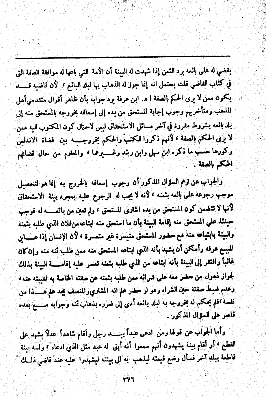ـــــــــــــــــــــــــــــQيَقْضِيَ لَهُ عَلَى بَائِعِهِ بِرَدِّ الثَّمَنِ إذَا شَهِدَتْ لَهُ الْبَيِّنَةُ أَنَّ الْأَمَةَ الَّتِي بَاعَهَا لَهُ مُوَافِقَةٌ لِلصِّفَةِ الَّتِي فِي كِتَابِ الْقَاضِي قُلْت يُحْتَمَلُ أَنَّهُ إنَّمَا يَجُوزُ لَهُ الذَّهَابُ بِهَا لِبَلَدِ الْبَائِعِ لِأَنَّ قَاضِيَهُ قَدْ يَكُونُ مَعَهُ لَا يَرَى الْحُكْمَ بِالصِّفَةِ اهـ. ابْنُ عَرَفَةَ يُرَدُّ جَوَابُهُ بِأَنَّ ظَاهِرَ أَقْوَالِ مُتَقَدِّمِي أَهْلِ الْمَذْهَبِ وَمُتَأَخِّرِيهِمْ وُجُوبُ إجَابَةِ الْمُسْتَحِقِّ مِنْ يَدِهِ إلَى إسْعَافِهِ بِخُرُوجِهِ بِالْمُسْتَحَقِّ مِنْهُ إلَى بَلَدِ بَائِعِهِ بِشُرُوطٍ مُقَرَّرَةٍ فِي آخِرِ مَسَائِلِ الِاسْتِحْقَاقِ لَيْسَ لِاحْتِمَالِ كَوْنِ الْمَكْتُوبِ إلَيْهِ مِمَّنْ لَا يَرَى الْحُكْمَ بِالصِّفَةِ، لِأَنَّهُمْ ذَكَرُوا الْكَتْبَ وَالْحُكْمَ بِخُرُوجِهِ بَيْنَ قُضَاةِ الْأَنْدَلُسِ وَكُوَرِهَا حَسَبَ مَا ذَكَرَهُ ابْنُ سَهْلٍ وَابْنُ رُشْدٍ وَغَيْرُهُمَا، وَالْمَعْلُومُ مِنْ حَالِ قُضَاتِهِمْ الْحُكْمُ بِالصِّفَةِ.