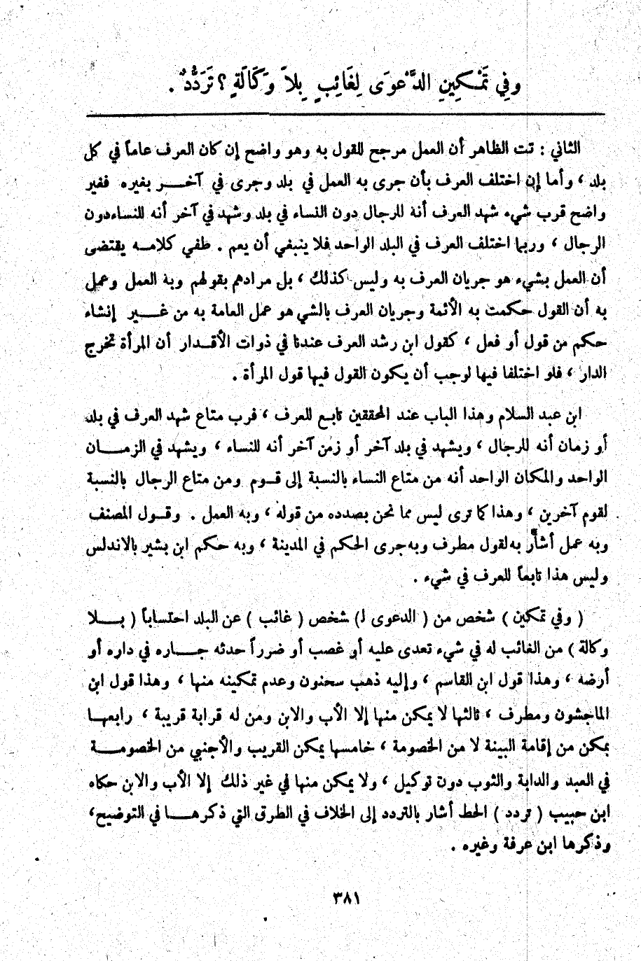 ـــــــــــــــــــــــــــــQالثَّانِي: تت الظَّاهِرُ أَنَّ الْعَمَلَ مُرَجِّحٌ لِلْقَوْلِ وَهُوَ وَاضِحٌ إنْ كَانَ الْعُرْفُ عَامًّا فِي كُلِّ بَلَدٍ، وَأَمَّا إنْ اخْتَلَفَ الْعُرْفُ بِأَنْ جَرَى بِهِ الْعَمَلُ فِي بَلَدٍ وَجَرَى فِي آخَرَ بِغَيْرِهِ فَغَيْرُ وَاضِحٍ فَرُبَّ شَيْءٍ شَهِدَ الْعُرْفُ أَنَّهُ لِلرِّجَالِ دُونَ النِّسَاءِ فِي بَلَدٍ وَشَهِدَ فِي آخَرَ أَنَّهُ لِلنِّسَاءِ دُونَ الرِّجَالِ، وَرُبَّمَا اخْتَلَفَ الْعُرْفُ فِي الْبَلَدِ الْوَاحِدِ فَلَا يَنْبَغِي أَنْ يَعُمَّ. طفي كَلَامُهُ يَقْتَضِي أَنَّ الْعَمَلَ بِشَيْءٍ هُوَ جَرَيَانُ الْعُرْفِ بِهِ وَلَيْسَ كَذَلِكَ، بَلْ مُرَادُهُمْ بِقَوْلِهِمْ وَبِهِ الْعَمَلُ وَعُمِلَ بِهِ أَنَّ الْقَوْلَ حَكَمَتْ بِهِ الْأَئِمَّةُ وَجَرَيَانُ الْعُرْفِ بِالشَّيْءِ هُوَ عَمَلُ الْعَامَّةِ بِهِ مِنْ غَيْرِ إنْشَاءِ حُكْمٍ مِنْ قَوْلٍ أَوْ فِعْلٍ، كَقَوْلِ ابْنِ رُشْدٍ الْعُرْفُ عِنْدَنَا فِي ذَوَاتِ الْأَقْدَارِ أَنَّ الْمَرْأَةَ تَخْرُجُ الدَّارَ، فَلَوْ اخْتَلَفَا فِيهَا لَوَجَبَ أَنْ يَكُونَ الْقَوْلُ فِيهَا قَوْلَ الْمَرْأَةِ.