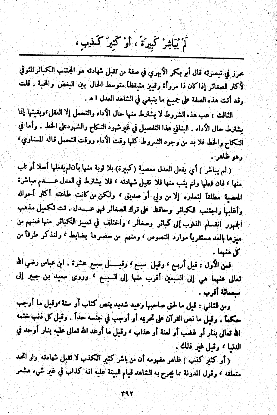 (لَمْ يُبَاشِرْ) أَيْ يَفْعَلْ الْعَدْلُ مَعْصِيَةً (كَبِيرَةً) بِلَا تَوْبَةٍ مِنْهَا بِأَنْ لَمْ يَفْعَلْهَا أَصْلًا أَوْ تَابَ مِنْهَا، فَإِنْ فَعَلَهَا وَلَمْ يَتُبْ مِنْهَا فَلَا تُقْبَلُ شَهَادَتُهُ، فَلَا يُشْتَرَطُ فِي الْعَدْلِ عَدَمُ مُبَاشَرَةِ الْمَعْصِيَةِ مُطْلَقًا لِتَعَذُّرِهِ إلَّا مِنْ وَلِيٍّ أَوْ صَدِيقٍ، وَلَكِنْ مَنْ كَانَتْ طَاعَتُهُ أَكْثَرَ أَحْوَالِهِ وَأَغْلَبَهَا وَاجْتَنَبَ الْكَبَائِرَ وَحَافَظَ عَلَى تَرْكِ الصَّغَائِر فَهُوَ عَدْلٌ. تت تَكْمِيلُ مَذْهَبِ الْجُمْهُورِ انْقِسَامُ الذُّنُوبِ إلَى كَبَائِرَ وَصَغَائِرَ، وَاخْتُلِفَ فِي تَمْيِيزِ الْكَبَائِرِ مِنْهَا فَمِنْهُمْ مَنْ مَيَّزَهَا بِالْعَدِّ مُسْتَقْرِيًا مَوَارِدَ النُّصُوصِ، وَمِنْهُمْ مَنْ حَصَرَهَا بِضَابِطٍ، وَلْنَذْكُرْ طَرَفًا مِنْ كُلٍّ مِنْهُمَا.