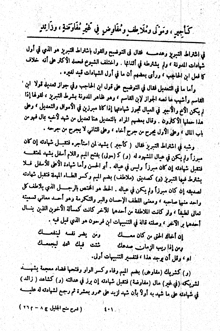 وَقَالَ بَعْضُهُمْ الْمُرَادُ بِالتَّعْدِيلِ هُنَا تَعْدِيلُ مَنْ شَهِدَ لِأَخِيهِ بِمَالٍ فَهُوَ مِنْ بَابِ الْمَالِ، وَعَلَى الْأَوَّلِ يُجَرَّحُ مَنْ جَرَّحَ أَخَاهُ، وَعَلَى الثَّانِي لَا يُجَرَّحُ مَنْ جَرَّحَهُ. وَشَبَّهَ فِي اشْتِرَاطِ التَّبْرِيزِ فَقَالَ (كَأَجِيرٍ) يَشْهَدُ لِمَنْ اسْتَأْجَرَ. فَتُقْبَلُ شَهَادَتُهُ إنْ كَانَ مُبَرِّزًا وَلَمْ يَكُنْ فِي عِيَالِ الْمَشْهُودِ لَهُ (وَ) كَ (مَوْلَى) بِفَتْحِ الْمِيمِ وَاللَّامِ أَسْفَلَ يَشْهَدُ لِمُعْتِقِهِ فَتُقْبَلُ شَهَادَتُهُ إنْ كَانَ مُبَرِّزًا وَلَيْسَ فِي عِيَالِهِ. أَبُو الْحَسَنِ وَأَمَّا شَهَادَةُ الْأَعْلَى لِلْأَسْفَلِ فَلَا يُشْتَرَطُ فِيهَا التَّبْرِيزُ (وَ) كَصَدِيقٍ (مُلَاطِفٍ) بِضَمِّ الْمِيمِ وَكَسْرِ الطَّاءِ الْمُهْمَلَةِ فَتُقْبَلُ شَهَادَتُهُ لِصَدِيقِهِ إنْ كَانَ مُبَرِّزًا وَلَمْ يَكُنْ فِي عِيَالِهِ. الْحَطّ هُوَ الْمُخْتَصُّ بِالرَّجُلِ الَّذِي يُلَاطِفُ كُلُّ وَاحِدٍ مِنْهُمَا صَاحِبَهُ، وَمَعْنَى اللُّطْفِ الْإِحْسَانُ وَالْبِرُّ وَالتَّكْرِمَةُ وَهُوَ أَحَدُ مَعَانِي تَسْمِيَتِهِ تَعَالَى لَطِيفًا، وَلَوْ كَانَتْ الْمُلَاطَفَةُ مِنْ أَحَدِهِمَا لِلْآخَرِ كَانَتْ كَمَسْأَلَةِ الْأَخَوَيْنِ اللَّذَيْنِ يَنَالُ أَحَدُهُمَا بِرَّ الْآخَرِ وَصِلَتَهُ قَالَهُ فِي التَّنْبِيهَاتِ ابْنُ فَرْحُونٍ هُوَ الَّذِي قِيلَ فِيهِ.