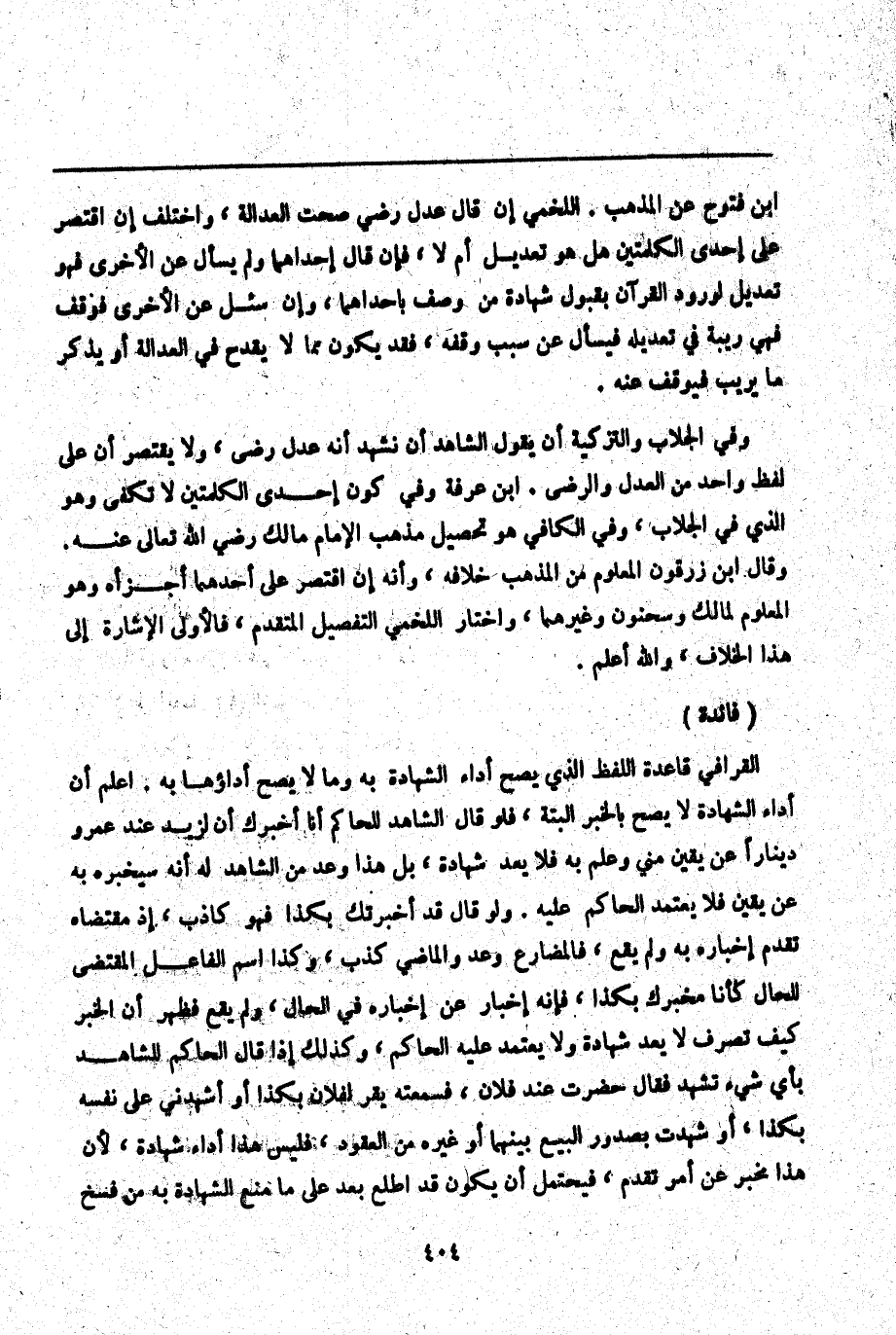 (فَائِدَةٌ) الْقَرَافِيُّ قَاعِدَةُ اللَّفْظِ الَّذِي يَصِحُّ أَدَاءُ الشَّهَادَةِ بِهِ وَمَا لَا يَصِحُّ أَدَاؤُهَا بِهِ. اعْلَمْ أَنَّ أَدَاءَ الشَّهَادَةِ لَا يَصِحُّ بِالْخَبَرِ أَلْبَتَّةَ، فَلَوْ قَالَ الشَّاهِدُ لِلْحَاكِمِ أَنَا أُخْبِرُك أَنَّ لِزَيْدٍ عِنْدَ عَمْرٍو دِينَارًا عَنْ يَقِينٍ مِنِّي وَعِلْمٍ بِهِ فَلَا يُعَدُّ شَهَادَةً، بَلْ هَذَا وَعْدٌ مِنْ الشَّاهِدِ لَهُ أَنَّهُ سَيُخْبِرُهُ بِهِ عَنْ يَقِينٍ فَلَا يَعْتَمِدُ الْحَاكِمُ عَلَيْهِ. وَلَوْ قَالَ قَدْ أَخْبَرْتُك بِكَذَا فَهُوَ كَاذِبٌ، إذْ مُقْتَضَاهُ تَقَدُّمُ إخْبَارِهِ بِهِ وَلَمْ يَقَعْ، فَالْمُضَارِعُ وَعْدٌ وَالْمَاضِي كَذِبٌ، وَكَذَا اسْمُ الْفَاعِلِ الْمُقْتَضِي لِلْحَالِ كَأَنَا مُخْبِرُك بِكَذَا، فَإِنَّهُ إخْبَارٌ عَنْ إخْبَارِهِ فِي الْحَالِ، وَلَمْ يَقَعْ فَظَهَرَ أَنَّ الْخَبَرَ كَيْفَ تَصَرَّفَ لَا يُعَدُّ شَهَادَةً وَلَا يَعْتَمِدُ عَلَيْهِ الْحَاكِمُ، وَكَذَلِكَ إذَا قَالَ الْحَاكِمُ لِلشَّاهِدِ بِأَيِّ شَيْءٍ تَشْهَدُ فَقَالَ حَضَرْت عِنْدَ فُلَانٍ، فَسَمِعْته يُقِرُّ لِفُلَانٍ بِكَذَا أَوْ أَشْهَدَنِي عَلَى نَفْسِهِ بِكَذَا، أَوْ شَهِدْت بِصُدُورِ الْبَيْعِ بَيْنَهُمَا أَوْ غَيْرِهِ مِنْ الْعُقُودِ، فَلَيْسَ هَذَا أَدَاءُ شَهَادَةٍ؛ لِأَنَّ هَذَا مُخْبِرٌ عَنْ أَمْرٍ تَقَدَّمَ، فَيُحْتَمَلُ أَنْ يَكُونَ قَدْ اطَّلَعَ بَعْدُ عَلَى مَا مَنَعَ الشَّهَادَةَ بِهِ مِنْ فَسْخٍ