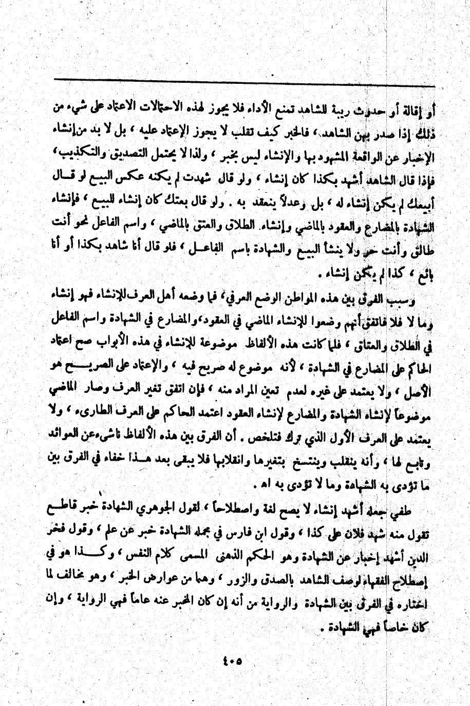 وَسَبَبُ الْفَرْقِ بَيْنَ هَذِهِ الْمَوَاطِنِ الْوَضْعُ الْعُرْفِيُّ، فَمَا وَضَعَهُ أَهْلُ الْعُرْفِ لِلْإِنْشَاءِ فَهُوَ إنْشَاءٌ وَمَا لَا فَلَا فَاتُّفِقَ أَنَّهُمْ وَضَعُوا لِلْإِنْشَاءِ الْمَاضِيَ فِي الْعُقُودِ، وَالْمُضَارِعَ فِي الشَّهَادَةِ وَاسْمَ الْفَاعِلِ فِي الطَّلَاقِ وَالْعَتَاقِ، فَلَمَّا كَانَتْ هَذِهِ الْأَلْفَاظُ مَوْضُوعَةً لِلْإِنْشَاءِ فِي هَذِهِ الْأَبْوَابِ صَحَّ اعْتِمَادُ الْحَاكِمِ عَلَى الْمُضَارِعِ فِي الشَّهَادَةِ؛ لِأَنَّهُ مَوْضُوعٌ لَهُ صَرِيحٌ فِيهِ، وَالِاعْتِمَادُ عَلَى الصَّرِيحِ هُوَ الْأَصْلُ، وَلَا يُعْتَمَدُ عَلَى غَيْرِهِ لِعَدَمِ تَعَيُّنِ الْمُرَادِ مِنْهُ، فَإِنْ اتَّفَقَ تَغَيُّرُ الْعُرْفِ وَصَارَ الْمَاضِي مَوْضُوعًا لِإِنْشَاءِ الشَّهَادَةِ وَالْمُضَارِعُ لِإِنْشَاءِ الْعُقُودِ اعْتَمَدَ الْحَاكِمُ عَلَى الْعُرْفِ الطَّارِئِ، وَلَا يَعْتَمِدُ عَلَى الْعُرْفِ الْأَوَّلِ الَّذِي تُرِكَ فَتَلَخَّصَ أَنَّ الْفَرْقَ بَيْنَ هَذِهِ الْأَلْفَاظِ نَاشِئٌ عَنْ الْعَوَائِدِ وَتَابِعٌ لَهَا، وَأَنَّهُ يَنْقَلِبُ وَيَنْتَسِخُ بِتَغَيُّرِهَا وَانْقِلَابِهَا فَلَا يَبْقَى بَعْدَ هَذَا خَفَاءٌ فِي الْفَرْقِ بَيْنَ مَا تُؤَدَّى بِهِ الشَّهَادَةُ وَمَا لَا تُؤَدَّى بِهِ اهـ. طفى جَعْلُهُ أَشْهَدُ إنْشَاءً لَا يَصِحُّ لُغَةً وَاصْطِلَاحًا، لِقَوْلِ الْجَوْهَرِيِّ الشَّهَادَةُ خَبَرٌ قَاطِعٌ تَقُولُ مِنْهُ شَهِدَ فُلَانٌ عَلَى كَذَا، وَقَوْلُ ابْنِ فَارِسٍ فِي مُجْمَلِهِ الشَّهَادَةُ خَبَرٌ عَنْ عِلْمٍ، وَقَوْلُ فَخْرِ الدَّيْنِ أَشْهَدُ إخْبَارٌ عَنْ الشَّهَادَةِ وَهُوَ الْحُكْمُ الذِّهْنِيُّ الْمُسَمَّى كَلَامَ النَّفْسِ، وَكَذَا هُوَ فِي اصْطِلَاحِ الْفُقَهَاءِ لِوَصْفِ الشَّاهِدِ بِالصِّدْقِ وَالزُّورِ، وَهُمَا مِنْ عَوَارِضِ الْخَبَرِ، وَهُوَ مُخَالِفٌ لِمَا اخْتَارَهُ فِي الْفَرْقِ بَيْنَ الشَّهَادَةِ وَالرِّوَايَةِ مِنْ أَنَّهُ إنْ كَانَ الْمُخْبَرُ عَنْهُ عَامًّا فَهِيَ الرِّوَايَةُ، وَإِنْ كَانَ خَاصًّا فَهِيَ الشَّهَادَةُ.