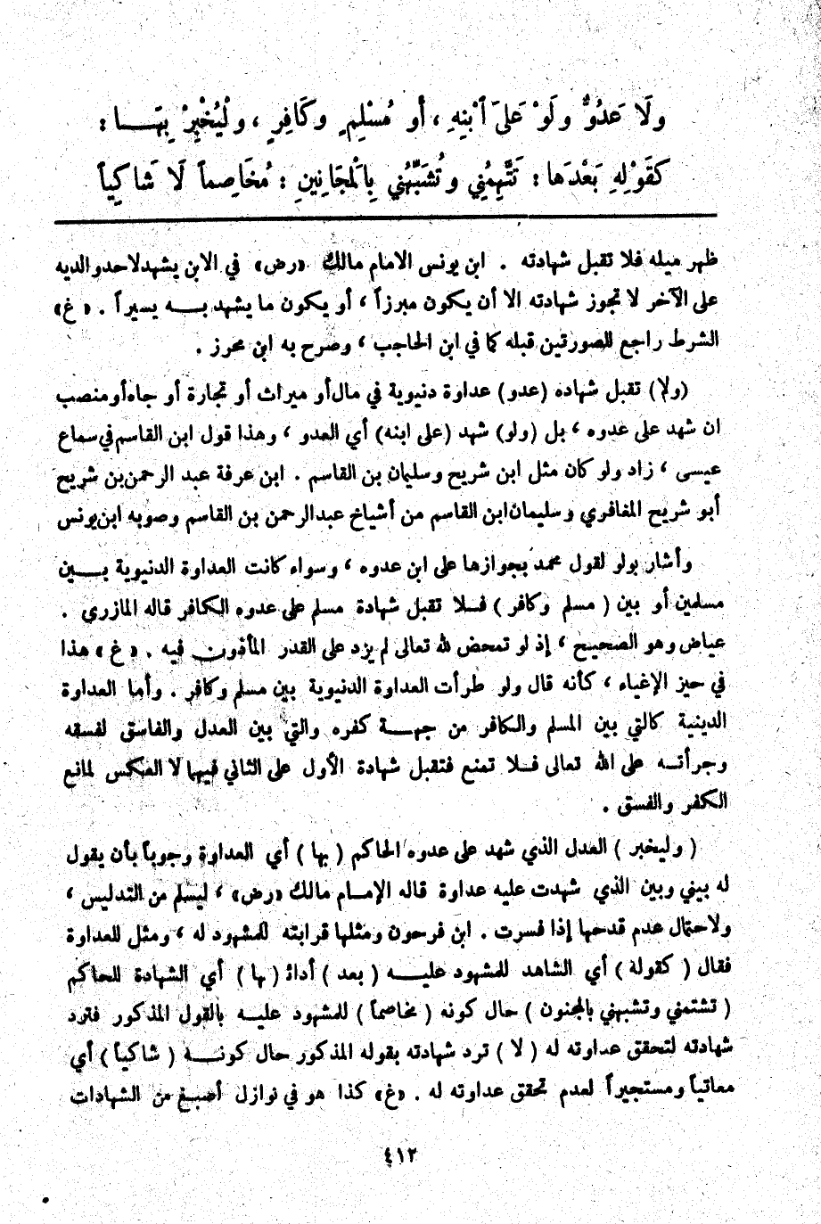(وَلَا) تُقْبَلُ شَهَادَةُ (عَدُوٍّ) عَدَاوَةً دُنْيَوِيَّةً فِي مَالٍ أَوْ مِيرَاثٍ أَوْ تِجَارَةٍ أَوْ جَاهٍ أَوْ مَنْصِبٍ إنْ شَهِدَ عَلَى عُدُوِّهِ، بَلْ (وَلَوْ) شَهِدَ (عَلَى ابْنِهِ) أَيْ الْعَدُوِّ، وَهَذَا قَوْلُ ابْنِ الْقَاسِمِ فِي سَمَاعِ عِيسَى، زَادَ وَلَوْ كَانَ مِثْلَ ابْنِ شُرَيْحٍ وَسُلَيْمَانَ بْنِ الْقَاسِمِ. ابْنُ عَرَفَةَ عَبْدُ الرَّحْمَنِ بْنُ شُرَيْحٍ أَبُو شُرَيْحٍ الْمَعَافِرِيُّ وَسُلَيْمَانُ بْنُ الْقَاسِمِ مِنْ أَشْيَاخِ عَبْدِ الرَّحْمَنِ بْنِ الْقَاسِمِ وَصَوَّبَهُ ابْنُ يُونُسَ وَأَشَارَ بِوَلَوْ لِقَوْلِ مُحَمَّدٍ بِجَوَازِهَا عَلَى ابْنِ عَدُوِّهِ، وَسَوَاءٌ كَانَتْ الْعَدَاوَةُ الدُّنْيَوِيَّةُ بَيْنَ مُسْلِمَيْنِ أَوْ بَيْنَ (مُسْلِمٍ وَكَافِرٍ) فَلَا تُقْبَلُ شَهَادَةُ مُسْلِمٍ عَلَى عَدُوِّهِ الْكَافِرِ قَالَهُ الْمَازِرِيُّ. عِيَاضٌ وَهُوَ الصَّحِيحُ، إذْ لَوْ تَمَحَّضَ لِلَّهِ تَعَالَى لَمْ يَزِدْ عَلَى الْقَدْرِ الْمَأْذُونِ فِيهِ. " غ " هَذَا فِي حَيِّزِ الْإِغْيَاءِ، كَأَنَّهُ قَالَ وَلَوْ طَرَأَتْ الْعَدَاوَةُ الدُّنْيَوِيَّةُ بَيْنَ مُسْلِمٍ وَكَافِرٍ. وَأَمَّا الْعَدَاوَةُ الدِّينِيَّةُ كَاَلَّتِي بَيْنَ الْمُسْلِمِ وَالْكَافِرِ مِنْ جِهَةِ كُفْرِهِ وَاَلَّتِي بَيْنَ الْعَدْلِ وَالْفَاسِقِ لِفِسْقِهِ وَجُرْأَتِهِ عَلَى اللَّهِ تَعَالَى فَلَا تَمْنَعُ فَتُقْبَلُ شَهَادَةُ الْأَوَّلِ عَلَى الثَّانِي فِيهِمَا لَا الْعَكْسُ لِمَانِعِ الْكُفْرِ وَالْفِسْقِ.