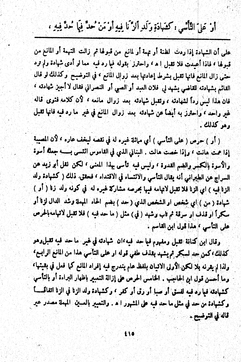 أَوْ عَلَى التَّأَسِّي: كَشَهَادَةِ وَلَدِ الزِّنَا فِيهِ أَوْ مَنْ حُدَّ فِيمَا حُدَّ فِيهِ