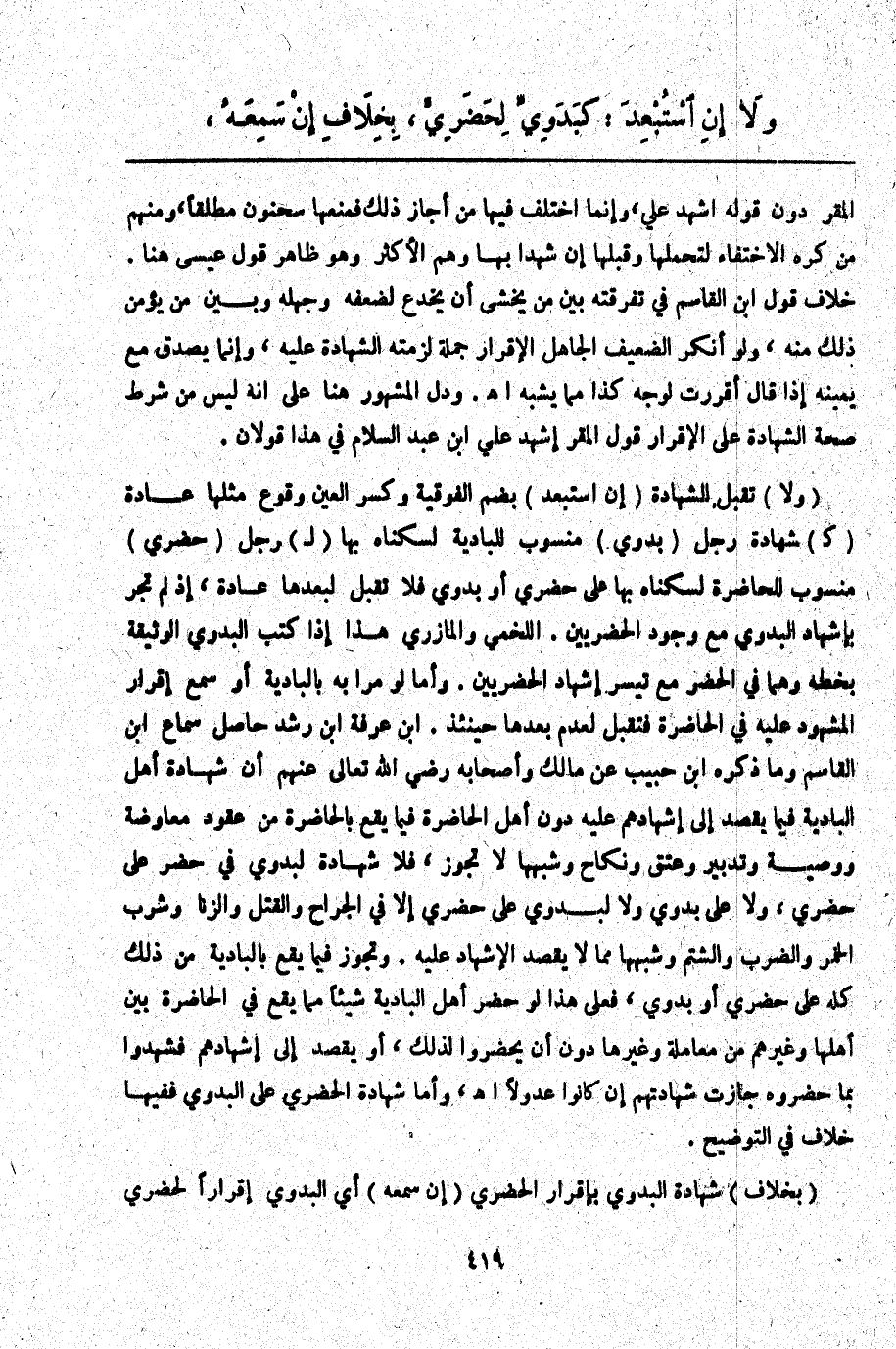 (وَلَا) تُقْبَلُ الشَّهَادَةُ (إنْ اُسْتُبْعِدَ) بِضَمِّ الْفَوْقِيَّةِ وَكَسْرِ الْعَيْنِ وُقُوعُ مِثْلِهَا عَادَةً (كَ) شَهَادَةِ رَجُلٍ (بَدْوِيٍّ) مَنْسُوبٍ لِلْبَادِيَةِ لِسُكْنَاهُ بِهَا (لِ) رَجُلٍ (حَضَرِيٍّ) مَنْسُوبٍ لِلْحَاضِرَةِ لِسُكْنَاهُ بِهَا عَلَى حَضَرِيٍّ أَوْ بَدْوِيٍّ فَلَا تُقْبَلُ لِبُعْدِهَا عَادَةً، إذْ لَمْ تَجْرِ بِإِشْهَادِ الْبَدْوِيِّ مَعَ وُجُودِ الْحَضَرِيِّينَ. اللَّخْمِيُّ وَالْمَازِرِيُّ هَذَا إذَا كَتَبَ الْبَدَوِيُّ الْوَثِيقَةَ بِخَطِّهِ وَهُمَا فِي الْحَضَرِ مَعَ تَيَسُّرِ إشْهَادِ الْحَضَرِيِّينَ. وَأَمَّا لَوْ مَرَّا بِهِ بِالْبَادِيَةِ أَوْ سَمِعَ إقْرَارَ الْمَشْهُودِ عَلَيْهِ فِي الْحَاضِرَةِ فَتُقْبَلُ لِعَدَمِ بُعْدِهَا حِينَئِذٍ. ابْنُ عَرَفَةَ ابْنُ رُشْدٍ حَاصِلُ سَمَاعِ ابْنِ الْقَاسِمِ وَمَا ذَكَرَهُ ابْنُ حَبِيبٍ عَنْ مَالِكٍ وَأَصْحَابِهِ - رَضِيَ اللَّهُ تَعَالَى عَنْهُمْ - أَنَّ شَهَادَةَ أَهْلِ الْبَادِيَةِ فِيمَا يُقْصَدُ إلَى إشْهَادِهِمْ عَلَيْهِ دُونَ أَهْلِ الْحَاضِرَةِ فِيمَا يَقَعُ بِالْحَاضِرَةِ مِنْ عُقُودِ مُعَاوَضَةٍ وَوَصِيَّةٍ وَتَدْبِيرٍ وَعِتْقٍ وَنِكَاحٍ وَشَبَهِهَا لَا تَجُوزُ، فَلَا شَهَادَةَ لِبَدَوِيٍّ فِي حَضَرٍ عَلَى حَضَرِيٍّ، وَلَا عَلَى بِدَوِيٍّ وَلَا لِبَدَوِيٍّ عَلَى حَضَرِيٍّ إلَّا فِي الْجِرَاحِ وَالْقَتْلِ وَالزِّنَا وَشُرْبِ الْخَمْرِ وَالضَّرْبِ وَالشَّتْمِ وَشَبَهِهَا مِمَّا لَا يُقْصَدُ الْإِشْهَادُ عَلَيْهِ. وَتَجُوزُ فِيمَا يَقَعُ بِالْبَادِيَةِ مِنْ ذَلِكَ كُلِّهِ عَلَى حَضَرِيٍّ أَوْ بِدَوِيٍّ، فَعَلَى هَذَا لَوْ حَضَرَ أَهْلُ الْبَادِيَةِ شَيْئًا مِمَّا يَقَعُ فِي الْحَاضِرَةِ بَيْنَ أَهْلِهَا وَغَيْرِهِمْ مِنْ مُعَامَلَةٍ وَغَيْرِهَا دُونَ أَنْ يَحْضُرُوا لِذَلِكَ، أَوْ يُقْصَدَ إلَى إشْهَادِهِمْ فَشَهِدُوا بِمَا حَضَرُوهُ جَازَتْ شَهَادَتُهُمْ إنْ كَانُوا عُدُولًا. اهـ. وَأَمَّا شَهَادَةُ الْحَضَرِيِّ عَلَى الْبَدَوِيِّ فَفِيهَا خِلَافٌ فِي التَّوْضِيحِ. (بِخِلَافِ) شَهَادَةِ الْبَدَوِيِّ بِإِقْرَارِ الْحَضَرِيِّ (إنْ سَمِعَهُ) أَيْ الْبَدْوِيُّ إقْرَارًا لِحَضَرِيٍّ