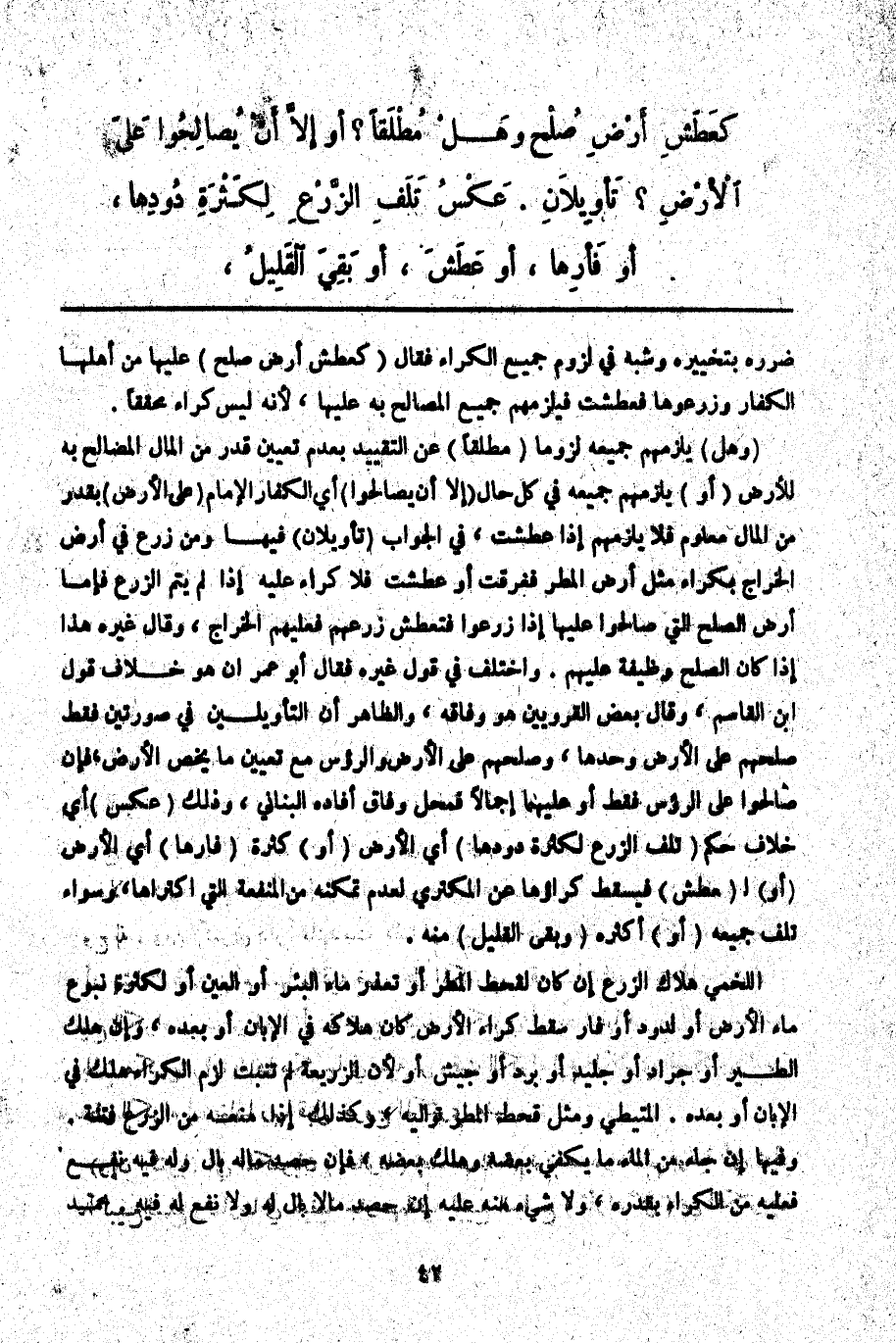 كَعَطَشِ أَرْضِ صُلْحٍ وَهَلْ مُطْلَقًا؟ أَوْ إلَّا أَنْ يُصَالِحُوا عَلَى الْأَرْضِ؟ تَأْوِيلَانِ. عَكْسُ تَلَفِ الزَّرْعِ لِكَثْرَةِ دُودِهَا، أَوْ فَأْرِهَا، أَوْ عَطَشٍ، أَوْ بَقِيَ الْقَلِيلُ