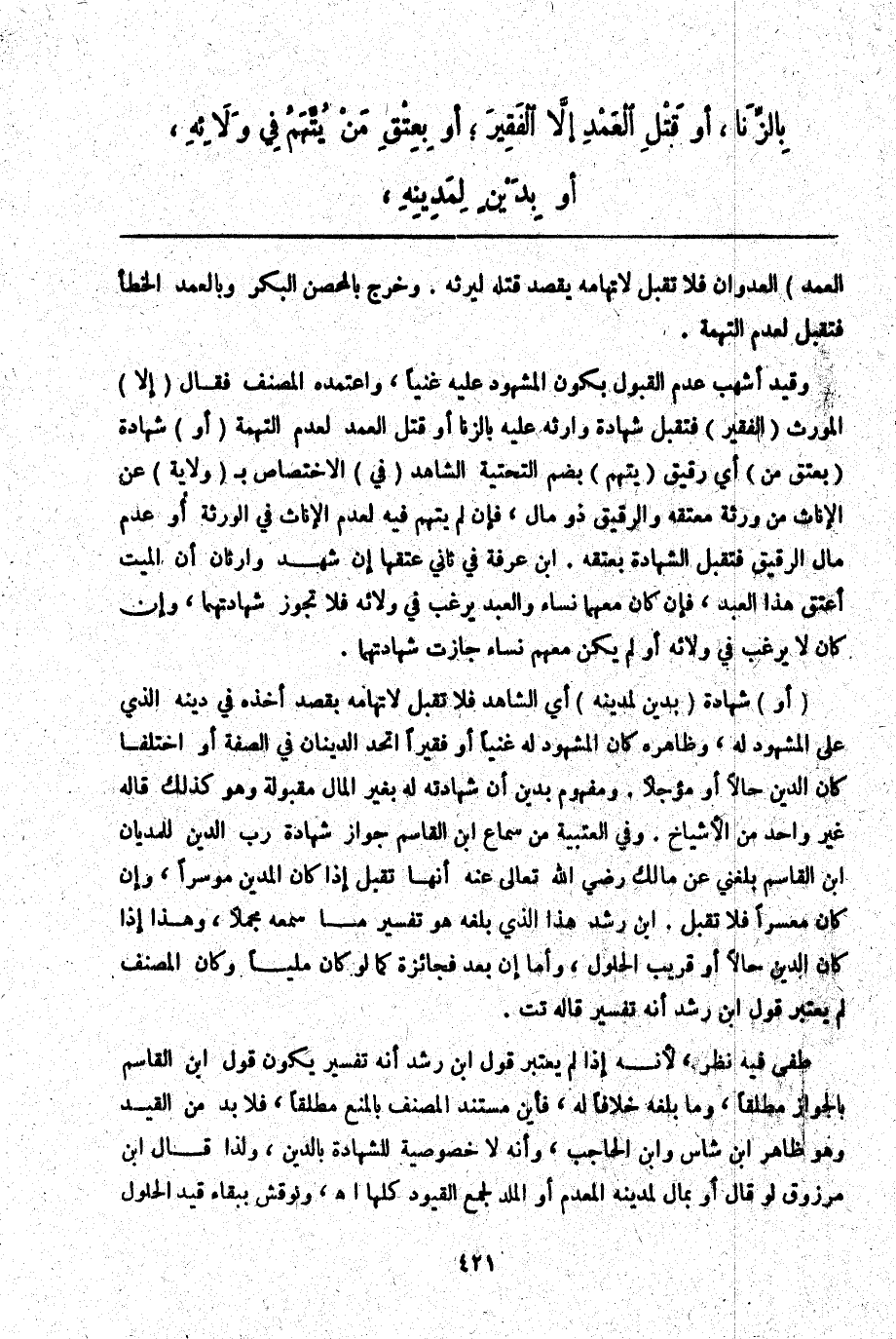 ـــــــــــــــــــــــــــــQالْعَمْدِ) الْعُدْوَانِ فَلَا تُقْبَلُ لِاتِّهَامِهِ بِقَصْدِ قَتْلِهِ لِيَرِثَهُ. وَخَرَجَ بِالْمُحْصَنِ الْبِكْرُ وَبِالْعَمْدِ الْخَطَأُ فَتُقْبَلُ لِعَدَمِ التُّهْمَةِ. وَقَيَّدَ أَشْهَبُ عَدَمَ الْقَبُولِ بِكَوْنِ الْمَشْهُودِ عَلَيْهِ غَنِيًّا وَاعْتَمَدَهُ الْمُصَنِّفُ فَقَالَ (إلَّا) الْمُوَرِّثَ (الْفَقِيرَ) فَتُقْبَلُ شَهَادَةُ وَارِثِهِ عَلَيْهِ بِالزِّنَا أَوْ قَتْلِ الْعَمْدِ لِعَدَمِ التُّهْمَةِ (أَوْ) شَهَادَةٌ (بِعِتْقِ مَنْ) أَيْ رَقِيقٍ (يُتَّهَمُ) بِضَمِّ التَّحْتِيَّةِ الشَّاهِدُ (فِي) الِاخْتِصَاصِ بِ (وَلَائِهِ) عَنْ الْإِنَاثِ مِنْ وَرَثَةِ مُعْتِقِهِ وَالرَّقِيقُ ذُو مَالٍ، فَإِنْ لَمْ يُتَّهَمْ فِيهَا لِعَدَمِ الْإِنَاثِ فِي الْوَرَثَةِ أَوْ عَدَمِ مَالِ الرَّقِيقِ فَتُقْبَلُ الشَّهَادَةُ بِعِتْقِهِ. ابْنُ عَرَفَةَ فِي ثَانِي عِتْقِهَا إنْ شَهِدَ وَارِثَانِ أَنَّ الْمَيِّتَ أَعْتَقَ هَذَا الْعَبْدَ، فَإِنْ كَانَ مَعَهُمَا نِسَاءٌ وَالْعَبْدُ يَرْغَبُ فِي وَلَائِهِ فَلَا تَجُوزُ شَهَادَتُهُمَا، وَإِنْ كَانَ لَا يَرْغَبُ فِي وَلَائِهِ أَوْ لَمْ يَكُنْ مَعَهُمْ نِسَاءٌ جَازَتْ شَهَادَتُهُمَا. (أَوْ) شَهَادَةٌ (بِدَيْنٍ لِمَدِينِهِ) أَيْ الشَّاهِدِ فَلَا تُقْبَلُ لِاتِّهَامِهِ بِقَصْدِ أَخْذِهِ فِي دَيْنِهِ الَّذِي عَلَى الْمَشْهُودِ لَهُ، وَظَاهِرُهُ كَانَ الْمَشْهُودُ لَهُ غَنِيًّا أَوْ فَقِيرًا اتَّحَدَ الدَّيْنَانِ فِي الصِّفَةِ أَوْ اخْتَلَفَا كَانَ الدَّيْنُ حَالًّا أَوْ مُؤَجَّلًا. وَمَفْهُومُ بِدَيْنٍ أَنَّ شَهَادَتَهُ لَهُ بِغَيْرِ الْمَالِ مَقْبُولَةٌ وَهُوَ كَذَلِكَ قَالَهُ غَيْرُ وَاحِدٍ مِنْ الْأَشْيَاخِ. وَفِي الْعُتْبِيَّةِ مِنْ سَمَاعِ ابْنِ الْقَاسِمِ جَوَازُ شَهَادَةِ رَبِّ الدَّيْنِ لِلْمَدِينِ ابْنُ الْقَاسِمِ بَلَغَنِي عَنْ مَالِكٍ - رَضِيَ اللَّهُ تَعَالَى عَنْهُ - أَنَّهَا تُقْبَلُ إذَا كَانَ الْمَدِينُ مُوسِرًا، وَإِنْ كَانَ مُعْسِرًا فَلَا تُقْبَلُ. ابْنُ رُشْدٍ هَذَا الَّذِي بَلَغَهُ هُوَ تَفْسِيرُ مَا سَمِعَهُ مُجْمَلًا، وَهَذَا إذَا كَانَ الدَّيْنُ حَالًّا أَوْ قَرِيبَ الْحُلُولِ، وَأَمَّا إنْ بَعُدَ فَجَائِزَةٌ كَمَا لَوْ كَانَ مَلِيًّا وَكَأَنَّ الْمُصَنِّفَ لَمْ يَعْتَبِرْ قَوْلَ ابْنِ رُشْدٍ أَنَّهُ تَفْسِيرٌ. قَالَهُ تت.