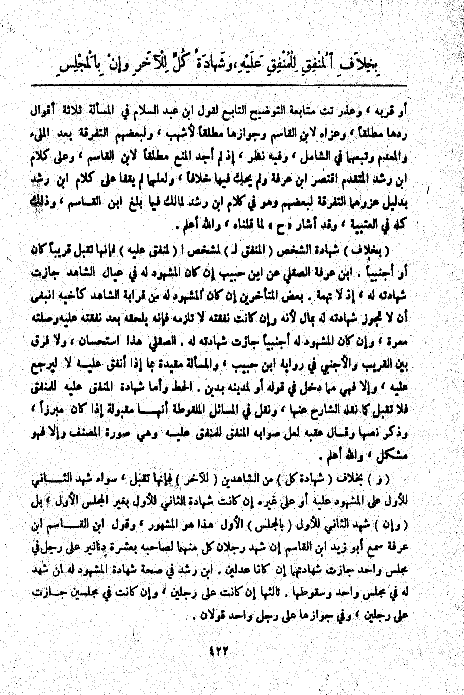 (بِخِلَافِ) شَهَادَةِ الشَّخْصِ (الْمُنْفِقِ لِ) لِشَخْصِ ا (لِمُنْفَقٍ عَلَيْهِ) فَإِنَّهَا تُقْبَلُ قَرِيبًا كَانَ أَوْ أَجْنَبِيًّا. ابْنُ عَرَفَةَ الصِّقِلِّيُّ ابْنُ حَبِيبٍ إنْ كَانَ الْمَشْهُودُ لَهُ فِي عِيَالِ الشَّاهِدِ جَازَتْ شَهَادَتُهُ لَهُ إذْ لَا تُهْمَةَ. بَعْضُ الْمُتَأَخِّرِينَ وَإِنْ كَانَتْ الْمَشْهُودُ لَهُ مِنْ قَرَابَةِ الشَّاهِدِ كَأَخِيهِ انْبَغَى أَنْ لَا تَجُوزَ شَهَادَتُهُ لَهُ بِمَالٍ؛ لِأَنَّهُ وَإِنْ كَانَتْ نَفَقَتُهُ لَا تَلْزَمُهُ فَإِنَّهُ يَلْحَقُهُ بَعْدَ نَفَقَتِهِ عَلَيْهِ وَصِلَتِهِ مَعَرَّةٌ، وَإِنْ كَانَ الْمَشْهُودُ لَهُ أَجْنَبِيًّا جَازَتْ شَهَادَتُهُ لَهُ. الصِّقِلِّيُّ هَذَا اسْتِحْسَانٌ، وَلَا فَرْقَ بَيْنَ الْقَرِيبِ وَالْأَجْنَبِيِّ فِي رِوَايَةِ ابْنِ حَبِيبٍ، وَالْمَسْأَلَةُ مُقَيَّدَةٌ بِمَا إذَا أَنْفَقَ عَلَيْهِ لَا لِيَرْجِعَ عَلَيْهِ، وَإِلَّا فَهِيَ مِمَّا دَخَلَ فِي قَوْلِهِ أَوْ لِمَدِينِهِ بِدَيْنٍ. الْحَطّ وَأَمَّا شَهَادَةُ الْمُنْفَقِ عَلَيْهِ لِلْمُنْفِقِ فَلَا تُقْبَلُ كَمَا نَقَلَهُ الشَّارِحُ عَنْهَا، وَنَقَلَ فِي الْمَسَائِلِ الْمَلْقُوطَةِ أَنَّهَا مَقْبُولَةٌ إذَا كَانَ مُبَرِّزًا، وَذَكَرَ نَصَّهَا وَقَالَ عَقِبَهُ لَعَلَّ صَوَابَهُ الْمُنْفِقُ لِلْمُنْفَقِ عَلَيْهِ وَهِيَ صُورَةُ الْمُصَنِّفِ وَإِلَّا فَهُوَ مُشْكِلٌ، وَاَللَّهُ أَعْلَمُ. (وَ) بِخِلَافِ (شَهَادَةِ كُلٍّ) مِنْ الشَّاهِدَيْنِ (لِلْآخَرِ) فَإِنَّهَا تُقْبَلُ، سَوَاءٌ شَهِدَ الثَّانِي لِلْأَوَّلِ عَلَى الْمَشْهُودِ عَلَيْهِ أَوْ عَلَى غَيْرِهِ إنْ كَانَتْ شَهَادَةُ الثَّانِي لِلْأَوَّلِ بِغَيْرِ الْمَجْلِسِ الْأَوَّلِ، بَلْ (وَإِنْ) شَهِدَ الثَّانِي لِلْأَوَّلِ (بِالْمَجْلِسِ) الْأَوَّلِ هَذَا هُوَ الْمَشْهُورُ، وَقَوْلُ ابْنِ الْقَاسِمِ ابْنُ عَرَفَةَ سَمِعَ أَبُو زَيْدٍ ابْن الْقَاسِمِ إنْ شَهِدَ رَجُلَانِ كُلٌّ مِنْهُمَا لِصَاحِبِهِ بِعَشَرَةِ دَنَانِيرَ عَلَى رَجُلٍ فِي مَجْلِسٍ وَاحِدٍ جَازَتْ شَهَادَتُهُمَا إنْ كَانَا عَدْلَيْنِ. ابْنُ رُشْدٍ فِي صِحَّةِ شَهَادَةِ الْمَشْهُودِ لَهُ لِمَنْ شَهِدَ لَهُ فِي مَجْلِسٍ وَاحِدٍ وَسُقُوطِهَا. ثَالِثُهَا إنْ كَانَتْ عَلَى رَجُلَيْنِ، وَإِنْ كَانَتْ فِي مَجْلِسَيْنِ جَازَتْ عَلَى رَجُلَيْنِ، وَفِي جَوَازِهَا عَلَى رَجُلٍ وَاحِدٍ قَوْلَانِ.