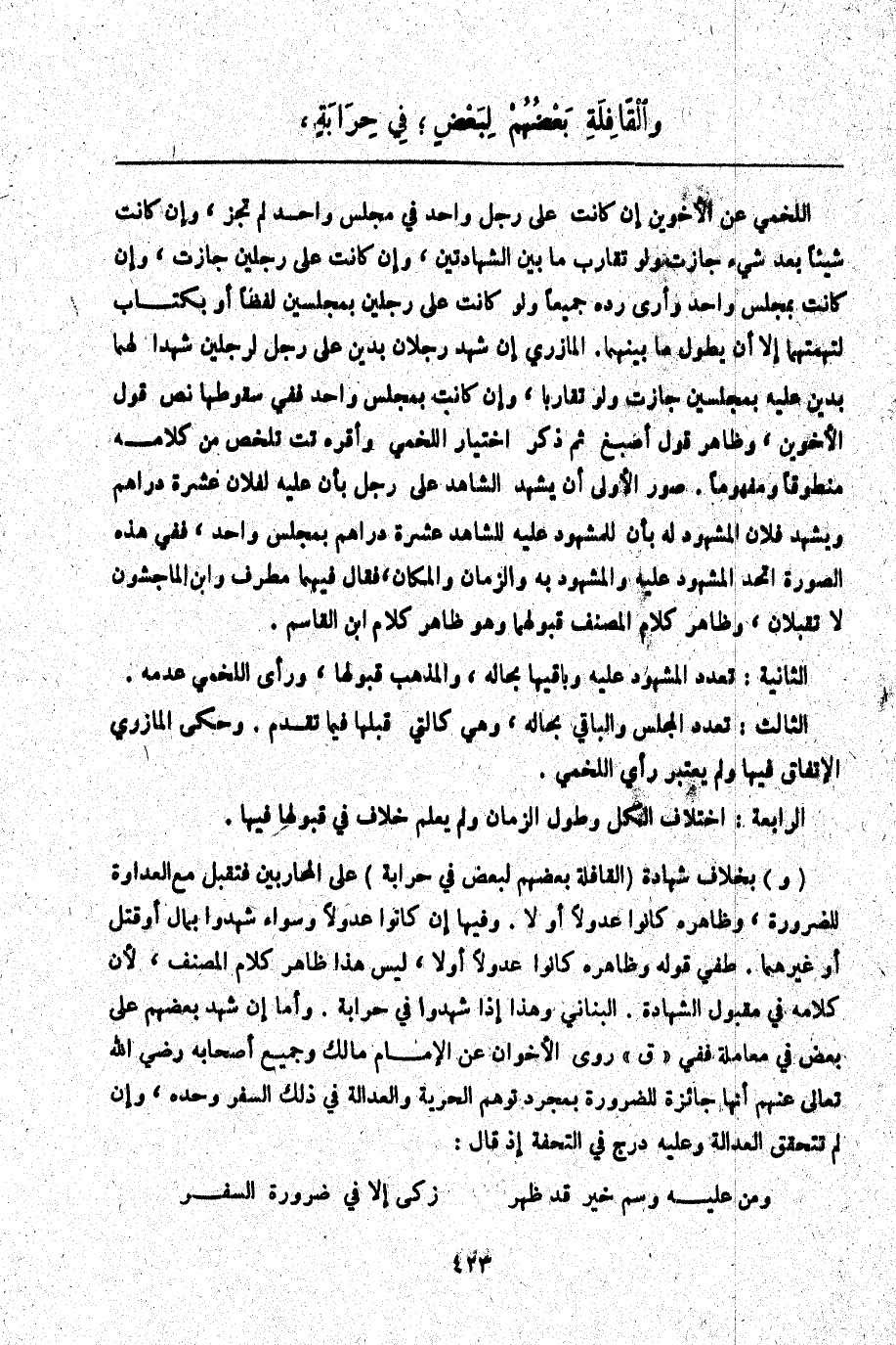 الرَّابِعَةُ: اخْتِلَافُ الْكُلِّ وَطُولُ الزَّمَانِ وَلَمْ يُعْلَمْ خِلَافٌ فِي قَبُولِهَا فِيهَا. (وَ) بِخِلَافِ شَهَادَةِ (الْقَافِلَةِ بَعْضِهِمْ لِبَعْضٍ فِي حِرَابَةٍ) عَلَى الْمُحَارَبِينَ فَتُقْبَلُ مَعَ الْعَدَاوَةِ لِلضَّرُورَةِ، وَظَاهِرُهُ كَانُوا عُدُولًا أَوْ لَا. وَفِيهَا إنْ كَانُوا عُدُولًا وَسَوَاءٌ شَهِدُوا بِمَالٍ أَوْ قَتْلٍ أَوْ غَيْرِهِمَا. طفى قَوْلُهُ وَظَاهِرُهُ كَانُوا عُدُولًا أَوْ لَا، لَيْسَ هَذَا ظَاهِرُ كَلَامِ الْمُصَنِّفِ؛ لِأَنَّ كَلَامَهُ فِي مَقْبُولِ الشَّهَادَةِ. الْبُنَانِيُّ وَهَذَا إذَا شَهِدُوا فِي حِرَابَةٍ. وَأَمَّا إنْ شَهِدَ بَعْضُهُمْ عَلَى بَعْضٍ فِي مُعَامَلَةٍ فَفِي " ق " رَوَى الْأَخَوَانِ عَنْ الْإِمَامِ مَالِكٍ وَجَمِيعِ أَصْحَابِهِ - رَضِيَ اللَّهُ تَعَالَى عَنْهُمْ - أَنَّهَا جَائِزَةٌ لِلضَّرُورَةِ بِمُجَرَّدِ تَوَهُّمِ الْحُرِّيَّةِ وَالْعَدَالَةِ فِي ذَلِكَ السَّفَرِ وَحْدَهُ، وَإِنْ لَمْ تَتَحَقَّقْ الْعَدَالَةُ، وَعَلَيْهِ دَرَجَ فِي التُّحْفَةِ إذْ قَالَ: