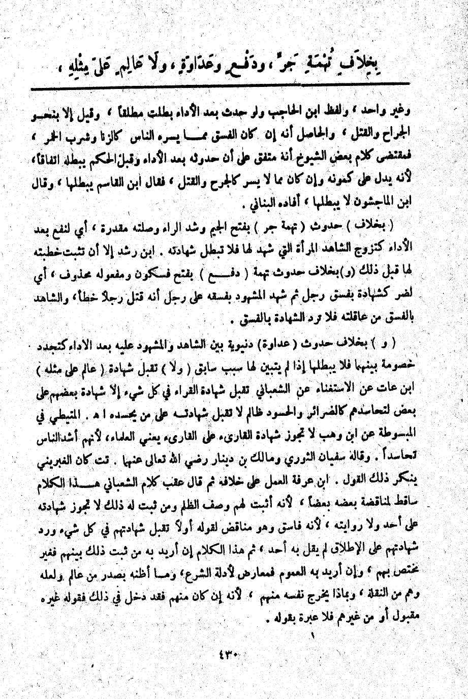 (وَلَا) تُقْبَلُ شَهَادَةُ (عَالِمٍ عَلَى مِثْلِهِ) ابْنُ عَاتٍ عَنْ الِاسْتِغْنَاءِ عَنْ الشَّعْبَانِيِّ تُقْبَلُ شَهَادَةُ الْقُرَّاءِ فِي كُلِّ شَيْءٍ إلَّا شَهَادَةَ بَعْضِهِمْ عَلَى بَعْضٍ لِتَحَاسُدِهِمْ كَالضَّرَائِرِ وَالْحَسُودُ ظَالِمٌ لَا تُقْبَلُ شَهَادَتُهُ عَلَى مَنْ يَحْسُدُهُ اهـ. الْمُتَيْطِيُّ فِي الْمَبْسُوطَةِ عَنْ ابْنِ وَهْبٍ لَا تَجُوزُ شَهَادَةُ الْقَارِئِ عَلَى الْقَارِئِ يَعْنِي الْعُلَمَاءَ؛ لِأَنَّهُمْ أَشَدُّ النَّاسِ تَحَاسُدًا. وَقَالَهُ سُفْيَانُ الثَّوْرِيُّ وَمَالِكُ بْنُ دِينَارٍ - رَضِيَ اللَّهُ تَعَالَى عَنْهُمَا -. تت كَانَ الْغُبْرِينِيُّ يُنْكِرُ ذَلِكَ الْقَوْلَ. ابْنُ عَرَفَةَ الْعَمَلُ عَلَى خِلَافِهِ ثُمَّ قَالَ عَقِبَ كَلَامِ الشَّعْبَانِيِّ هَذَا الْكَلَامُ سَاقِطٌ لِمُنَاقَضَةِ بَعْضِهِ بَعْضًا؛ لِأَنَّهُ أَثْبَتَ لَهُمْ وَصْفَ الظُّلْمِ وَمَنْ ثَبَتَ لَهُ ذَلِكَ لَا تَجُوزُ شَهَادَتُهُ عَلَى أَحَدٍ وَلَا رِوَايَتُهُ؛ لِأَنَّهُ فَاسِقٌ وَهُوَ مُنَاقِضٌ لِقَوْلِهِ أَوَّلًا تُقْبَلُ شَهَادَتُهُمْ فِي كُلِّ شَيْءٍ وَرَدُّ شَهَادَتِهِمْ عَلَى الْإِطْلَاقِ لَمْ يَقُلْ بِهِ أَحَدٌ، ثُمَّ هَذَا الْكَلَامُ إنْ أُرِيدَ بِهِ مَنْ ثَبَتَ ذَلِكَ بَيْنَهُمْ فَغَيْرُ مُخْتَصٍّ بِهِمْ، وَإِنْ أُرِيدَ بِهِ الْعُمُومُ فَمُعَارِضٌ لِأَدِلَّةِ الشَّرْعِ، وَمَا أَظُنُّهُ يَصْدُرُ مِنْ عَالِمٍ وَلَعَلَّهُ وَهْمٌ مِنْ النَّقَلَةِ، وَبِمَاذَا يُخَرِّجُ نَفْسَهُ مِنْهُمْ؛ لِأَنَّهُ إنْ كَانَ مِنْهُمْ فَقَدْ دَخَلَ فِي ذَلِكَ فَقَوْلُهُ غَيْرَهُ مَقْبُولٌ أَوْ مِنْ غَيْرِهِمْ فَلَا عِبْرَةَ بِقَوْلِهِ.
