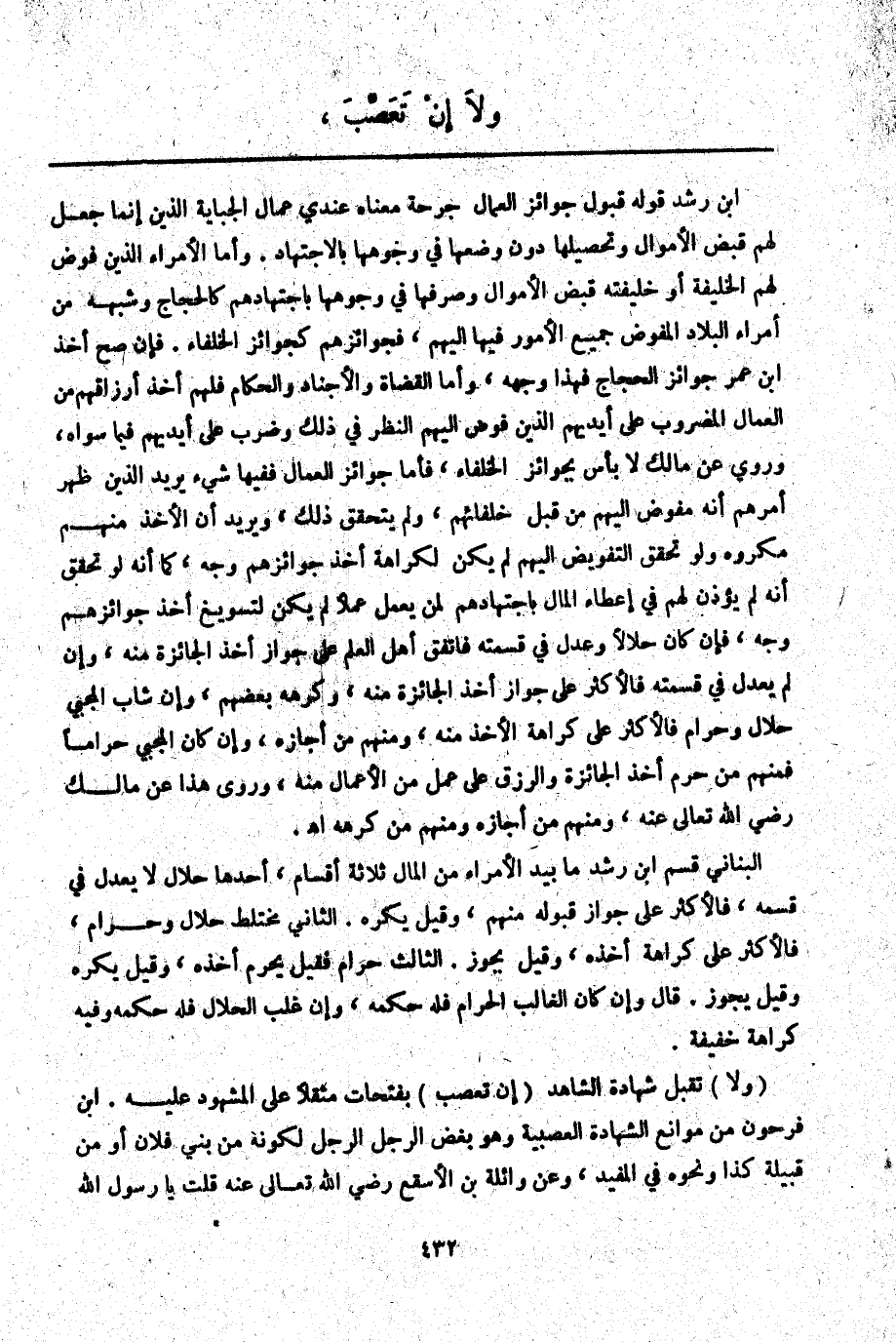 ـــــــــــــــــــــــــــــQابْنُ رُشْدٍ قَوْلُهُ قَبُولُ جَوَائِزِ الْعُمَّالِ جُرْحَةٌ مَعْنَاهُ عِنْدِي عُمَّالُ الْجِبَايَةِ الَّذِينَ إنَّمَا جُعِلَ لَهُمْ قَبْضُ الْأَمْوَالِ وَتَحْصِيلِهَا دُونَ وَضْعِهَا فِي وُجُوهِهَا بِالِاجْتِهَادِ. وَأَمَّا الْأُمَرَاءُ الَّذِينَ فَوَّضَ لَهُمْ الْخَلِيفَةُ أَوْ خَلِيفَتُهُ قَبْضَ الْأَمْوَالِ وَصَرْفَهَا فِي وُجُوهِهَا بِاجْتِهَادِهِمْ كَالْحَجَّاجِ وَشَبَهِهِ مِنْ أُمَرَاءِ الْبِلَادِ الْمُفَوَّضِ جَمِيعُ الْأُمُورِ فِيهَا إلَيْهِمْ، فَجَوَائِزُهُمْ كَجَوَائِزِ الْخُلَفَاءِ. فَإِنْ صَحَّ أَخْذُ ابْنِ عُمَرَ جَوَائِزَ الْحَجَّاجِ فَهَذَا وَجْهُهُ، وَأَمَّا الْقُضَاةُ وَالْأَجْنَادُ وَالْحُكَّامُ فَلَهُمْ أَخْذُ أَرْزَاقِهِمْ مِنْ الْعُمَّالِ الْمَضْرُوبِ عَلَى أَيْدِيهِمْ الَّذِينَ فُوِّضَ إلَيْهِمْ النَّظَرُ فِي ذَلِكَ وَضَرَبَ عَلَى أَيْدِيهِمْ فِيمَا سِوَاهُ، وَرُوِيَ عَنْ مَالِكٍ لَا بَأْسَ بِجَوَائِزِ الْخُلَفَاءِ، فَأَمَّا جَوَائِزُ الْعُمَّالِ فَفِيهَا شَيْءٌ يُرِيدُ الَّذِينَ ظَهَرَ أَمْرُهُمْ أَنَّهُ مُفَوَّضٌ إلَيْهِمْ مِنْ قِبَلِ خُلَفَائِهِمْ، وَلَمْ يَتَحَقَّقْ ذَلِكَ، وَيُرِيدُ أَنَّ الْأَخْذَ مِنْهُمْ مَكْرُوهٌ وَلَوْ تَحَقَّقَ التَّفْوِيضُ إلَيْهِمْ لَمْ يَكُنْ لِكَرَاهَةِ أَخْذِ جَوَائِزِهِمْ وَجْهٌ، كَمَا أَنَّهُ لَوْ تَحَقَّقَ أَنَّهُ لَمْ يُؤْذَنْ لَهُمْ فِي إعْطَاءِ الْمَالِ بِاجْتِهَادِهِمْ لِمَنْ يَعْمَلُ عَمَلًا لَمْ يَكُنْ لِتَسْوِيغِ أَخْذِ جَوَائِزِهِمْ وَجْهٌ، فَإِنْ كَانَ حَلَالًا وَعُدِلَ فِي قِسْمَتِهِ فَاتَّفَقَ أَهْلُ الْعِلْمِ عَلَى جَوَازِ أَخْذِ الْجَائِزَةِ مِنْهُ، وَإِنْ لَمْ يُعْدَلْ فِي قِسْمَتِهِ فَالْأَكْثَرُ عَلَى جَوَازِ أَخْذِ الْجَائِزَةِ مِنْهُ، وَكَرِهَهُ بَعْضُهُمْ، وَإِنْ شَابَ الْمَجْبِيَّ حَلَالٌ وَحَرَامٌ فَالْأَكْثَرُ عَلَى كَرَاهَةِ الْأَخْذِ مِنْهُ، وَمِنْهُمْ مَنْ أَجَازَهُ