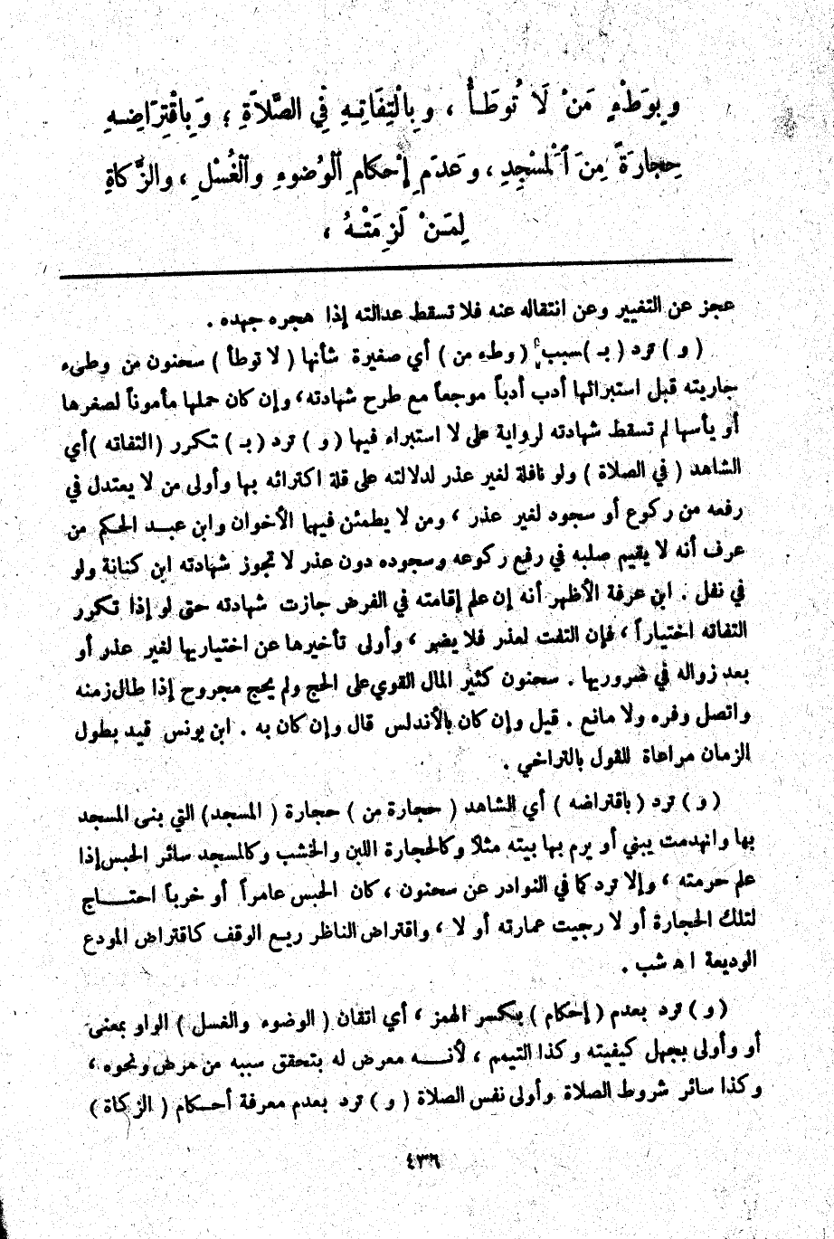 (وَ) تُرَدُّ (بِاقْتِرَاضِهِ) أَيْ الشَّاهِدِ (حِجَارَةً مِنْ) حِجَارَةِ (الْمَسْجِدِ) الَّتِي بُنِيَ الْمَسْجِدُ بِهَا وَانْهَدَمَتْ يَبْنِي أَوْ يَرُمُّ بِهَا بَيْتَهُ مَثَلًا وَكَالْحِجَارَةِ اللَّبِنُ وَالْخَشَبُ وَكَالْمَسْجِدِ سَائِرُ الْحَبْسِ إذَا عَلِمَ حُرْمَتَهُ، وَإِلَّا تُرَدُّ كَمَا فِي النَّوَادِرِ عَنْ سَحْنُونٍ، كَانَ الْحَبْسُ عَامِرًا أَوْ خَرِبًا احْتَاجَ لِتِلْكَ الْحِجَارَةِ أَوْ لَا رُجِيَتْ عِمَارَتُهُ أَوْ لَا، وَاقْتِرَاضُ النَّاظِرِ رِيعَ الْوَقْفِ كَاقْتِرَاضِ الْمُودَعِ الْوَدِيعَةَ اهـ شب. (وَ) تُرَدُّ بِعَدَمِ (إحْكَامِ) بِكَسْرِ الْهَمْزِ، أَيْ إتْقَانِ (الْوُضُوءِ وَالْغُسْلِ) الْوَاوُ بِمَعْنَى أَوْ وَأَوْلَى بِجَهْلِ كَيْفِيَّتِهِ وَكَذَا التَّيَمُّمُ؛ لِأَنَّهُ مُعَرَّضٌ لَهُ بِتَحَقُّقِ سَبَبِهِ مِنْ مَرَضٍ وَنَحْوِهِ، وَكَذَا سَائِرُ شُرُوطِ الصَّلَاةِ وَأَوْلَى نَفْسُ الصَّلَاةِ (وَ) تُرَدُّ بِعَدَمِ مَعْرِفَةِ أَحْكَامِ (الزَّكَاةِ)