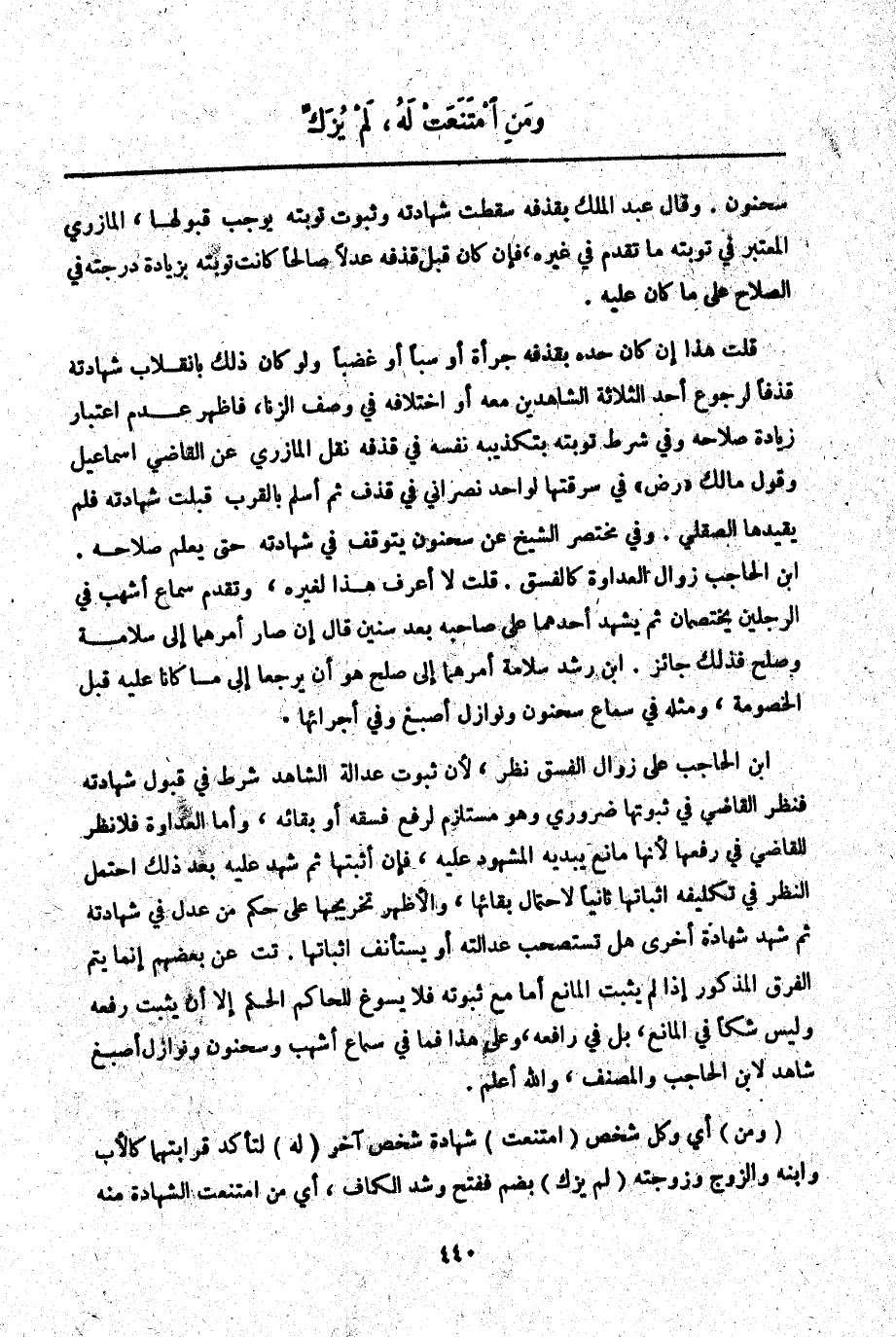ـــــــــــــــــــــــــــــQسَحْنُونٌ. وَقَالَ عَبْدُ الْمَلِكِ بِقَذْفِهِ سَقَطَتْ شَهَادَتُهُ وَثُبُوتُ تَوْبَتِهِ يُوجِبُ قَبُولَهَا الْمَازِرِيُّ الْمُعْتَبَرُ فِي تَوْبَتِهِ مَا تَقَدَّمَ فِي غَيْرِهِ، فَإِنْ كَانَ قَبْلَ قَذْفِهِ عَدْلًا صَالِحًا كَانَتْ تَوْبَتُهُ بِزِيَادَةِ دَرَجَتِهِ فِي الصَّلَاحِ عَلَى مَا كَانَ عَلَيْهِ.