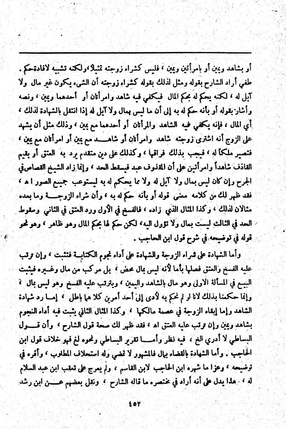 وَأَمَّا الشَّهَادَةُ عَلَى شِرَاءِ الزَّوْجَةِ وَالشَّهَادَةُ عَلَى أَدَاءِ نُجُومِ الْكِتَابَةِ فَتَثْبُتُ وَإِنْ تَرَتَّبَ عَلَيْهِ الْفَسْخُ وَالْعِتْقُ فَصَلَهَا بِأَمَّا؛ لِأَنَّهُ لَيْسَ بِمَالٍ مَحْضٍ، بَلْ مُرَكَّبٌ مِنْ مَالٍ وَغَيْرِهِ فَيَثْبُتُ الْبَيْعُ فِي الْمَسْأَلَةِ الْأُولَى وَهُوَ مَالٌ بِالشَّاهِدِ وَالْيَمِينِ، وَيَتَرَتَّبُ عَلَيْهِ الْفَسْخُ وَهُوَ لَيْسَ بِمَالٍ، وَإِنَّمَا حَكَمْنَا بِذَلِكَ؛ لِأَنَّا لَوْ لَمْ نَحْكُمْ بِهِ لَأَدَّى إلَى أَحَدِ أَمْرَيْنِ كِلَاهُمَا بَاطِلٌ، إمَّا رَدُّ شَهَادَةٍ بِشَاهِدٍ وَإِمَّا إبْقَاءُ الزَّوْجَةِ فِي عِصْمَةِ مَالِكِهَا، وَكَذَا الْمِثَالُ الثَّانِي يَثْبُتُ فِيهِ أَدَاءُ النُّجُومِ بِشَاهِدٍ وَيَمِينٍ وَإِنْ تَرَتَّبَ عَلَيْهِ الْعِتْقُ. اهـ. فَقَدْ ظَهَرَ لَك صِحَّةُ قَوْلِ الشَّارِحِ، وَأَنَّ قَوْلَ الْبِسَاطِيِّ لَا أَدْرِي إلَخْ فِيهِ نَظَرٌ وَأَمَّا تَقْرِيرُ الْبِسَاطِيِّ وَنَحْوُهُ لَغْ فَهُوَ خِلَافُ قَوْلِ ابْنِ الْحَاجِبِ، وَأَمَّا الشَّهَادَةُ بِالْقَضَاءِ بِمَالٍ فَالْمَشْهُورُ لَا تَمْضِي وَلَهُ اسْتِحْلَافُ الْمَطْلُوبِ، وَأَقَرَّهُ فِي تَوْضِيحِهِ، وَعَزَا مَا شَهَّرَهُ ابْنُ الْحَاجِبِ لِابْنِ الْقَاسِمِ، وَلَمْ يُعَرِّجْ عَلَى تَعَقُّبِ ابْنِ عَبْدِ السَّلَامِ لَهُ، وَهَذَا يَدُلُّ عَلَى أَنَّهُ أَرَادَ فِي مُخْتَصَرِهِ مَا قَالَهُ الشَّارِحُ، وَنَقَلَ بَعْضُهُمْ عَنْ ابْنِ رُشْدٍ