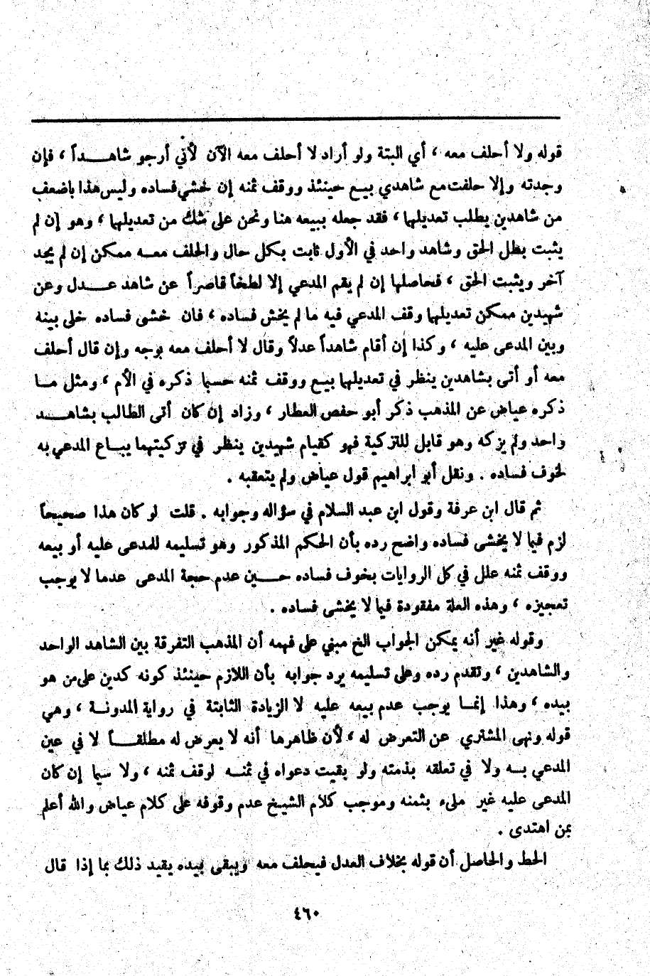 ـــــــــــــــــــــــــــــQقَوْلِهِ وَلَا أَحْلِفُ مَعَهُ أَيْ أَلْبَتَّةَ وَلَوْ أَرَادَ لَا أَحْلِفُ مَعَهُ الْآنَ لِأَنِّي أَرْجُو شَاهِدًا، فَإِنْ وَجَدْته وَإِلَّا حَلَفْت مَعَ شَاهِدِي بِيعَ حِينَئِذٍ وَوُقِفَ ثَمَنُهُ إنْ خُشِيَ فَسَادُهُ وَلَيْسَ هَذَا بِأَضْعَفَ مِنْ شَاهِدَيْنِ يُطْلَبُ تَعْدِيلُهُمَا، فَقَدْ جَعَلَهُ بِبَيْعِهِ هُنَا وَنَحْنُ عَلَى شَكٍّ مِنْ تَعْدِيلِهِمَا، وَهُوَ إنْ لَمْ يَثْبُتْ بَطَلَ الْحَقُّ وَشَاهِدٌ وَاحِدٌ فِي الْأَوَّلِ ثَابِتٌ بِكُلِّ حَالٍ وَالْحَلِفُ مَعَهُ مُمْكِنٌ إنْ لَمْ يَجِدْ آخَرَ وَيَثْبُتُ الْحَقُّ، فَحَاصِلُهَا إنْ لَمْ يُقِمْ الْمُدَّعِي إلَّا لَطْخًا قَاصِرًا عَنْ شَاهِدِ عَدْلٍ وَعَنْ شَهِيدَيْنِ مُمْكِنٍ تَعْدِيلُهُمَا وَقَفَ الْمُدَّعِي فِيهِ مَا لَمْ يَخْشَ فَسَادَهُ، فَإِنْ خَشِيَ فَسَادَهُ خَلَّى بَيْنَهُ وَبَيْنَ الْمُدَّعَى عَلَيْهِ، وَكَذَا إنْ أَقَامَ شَاهِدًا عَدْلًا وَقَالَ لَا أَحْلِفُ مَعَهُ بِوَجْهٍ وَإِنْ قَالَ أَحْلِفُ مَعَهُ أَوْ أَتَى بِشَاهِدَيْنِ يَنْظُرُ فِي تَعْدِيلَهُمَا بِيعَ وَوُقِفَ ثَمَنُهُ حَسْبَمَا ذَكَرَهُ فِي الْأُمِّ، وَمِثْلُ مَا ذَكَرَهُ عِيَاضٌ عَنْ الْمَذْهَبِ ذَكَرَ أَبُو حَفْصٍ الْعَطَّارُ، وَزَادَ إنْ كَانَ أَتَى الطَّالِبُ بِشَاهِدٍ وَاحِدٍ وَلَمْ يُزَكِّهِ وَهُوَ قَابِلٌ لِلتَّزْكِيَةِ فَهُوَ كَقِيَامِ شَهِيدَيْنِ يُنْظَرُ فِي تَزْكِيَتِهِمَا يُبَاعُ الْمُدَّعَى بِهِ لِخَوْفِ فَسَادِهِ. وَنَقَلَ أَبُو إبْرَاهِيمَ قَوْلَ عِيَاضٍ وَلَمْ يَتَعَقَّبْهُ. ثُمَّ قَالَ ابْنُ عَرَفَةَ وَقَوْلُ ابْنِ عَبْدِ السَّلَامِ فِي سُؤَالِهِ وَجَوَابِهِ.