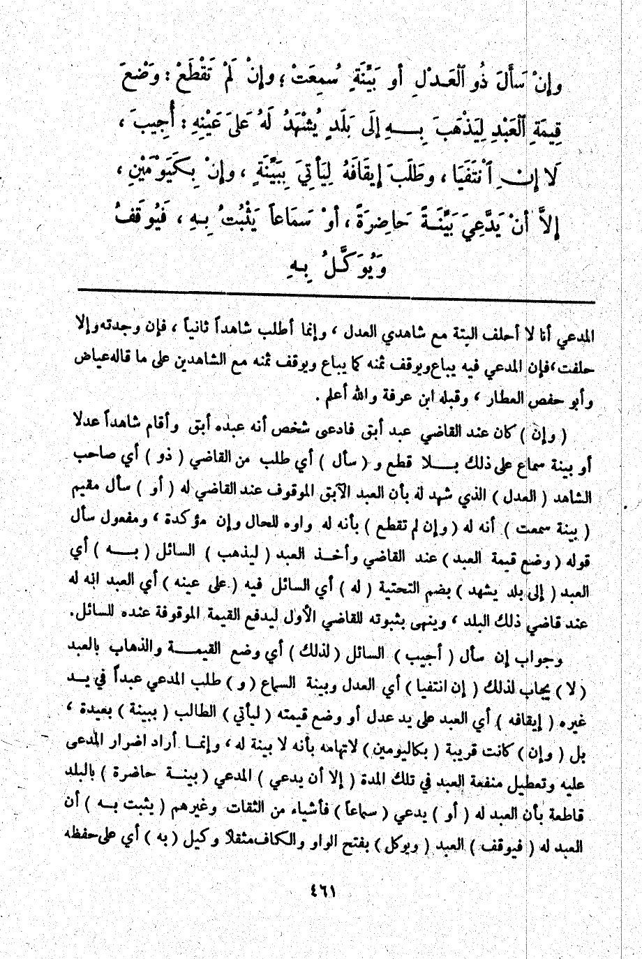 وَجَوَابُ إنْ سَأَلَ (أُجِيبَ) السَّائِلُ (لِذَلِكَ) أَيْ وَضْعِ الْقِيمَةِ وَالذَّهَابِ بِالْعَبْدِ (لَا) يُجَابُ لِذَلِكَ (إنْ انْتَفَيَا) أَيْ الْعَدْلُ وَبَيِّنَةُ السَّمَاعِ (وَ) طَلَبَ الْمُدَّعِي عَبْدًا فِي يَدِ غَيْرِهِ (إيقَافَهُ) أَيْ الْعَبْدِ عَلَى يَدِ عَدْلٍ أَوْ وَضْعِ قِيمَتِهِ (لِيَأْتِيَ) الطَّالِبُ (بِبَيِّنَةٍ) بَعِيدَةٍ، بَلْ (وَإِنْ) كَانَتْ قَرِيبَةً (بِكَالْيَوْمَيْنِ) لِاتِّهَامِهِ بِأَنَّهُ لَا بَيِّنَةَ لَهُ وَإِنَّمَا أَرَادَ إضْرَارَ الْمُدَّعَى عَلَيْهِ وَتَعْطِيلَ مَنْفَعَةِ الْعَبْدِ فِي تِلْكَ الْمُدَّةِ (إلَّا أَنْ يَدَّعِيَ) الْمُدَّعِي (بَيِّنَةً حَاضِرَةً) بِالْبَلَدِ قَاطِعَةً بِأَنَّ الْعَبْدَ لَهُ (أَوْ) يَدَّعِيَ (سَمَاعًا) فَأَشْيَاءُ مِنْ الثِّقَاتِ وَغَيْرِهِمْ (يَثْبُتُ بِهِ) أَنَّ الْعَبْدَ لَهُ (فَيُوقَفُ) الْعَبْدُ (وَيُوَكَّلُ) بِفَتْحِ الْوَاوِ وَالْكَافِ مُثَقَّلًا وَكِيلٌ (بِهِ) أَيْ عَلَى حِفْظِهِ