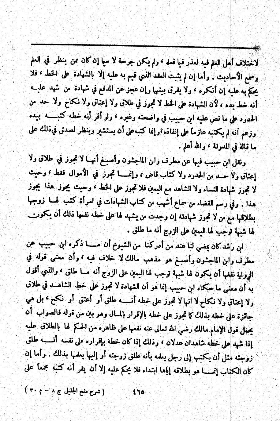 وَنَقَلَ ابْنُ حَبِيبٍ فِيهَا عَنْ مُطَرِّفٍ وَابْنِ الْمَاجِشُونِ وَأَصْبَغَ أَنَّهَا لَا تَجُوزُ فِي طَلَاقٍ وَلَا إعْتَاقٍ وَلَا حَدٍّ مِنْ الْحُدُودِ وَلَا كِتَابِ قَاضٍ، وَإِنَّمَا تَجُوزُ فِي الْأَمْوَالِ فَقَطْ وَحَيْثُ لَا تَجُوزُ شَهَادَةُ النِّسَاءِ وَلَا الشَّاهِدُ مَعَ الْيَمِينِ فَلَا تَجُوزُ عَلَى الْخَطِّ، وَحَيْثُ يَجُوزُ هَذَا يَجُوزُ هَذَا. وَفِي رَسْمِ الْقَضَاءِ مِنْ سَمَاعِ أَشْهَبَ مِنْ كِتَابِ الشَّهَادَاتِ فِي امْرَأَةٍ كَتَبَ لَهَا زَوْجُهَا بِطَلَاقِهَا مَعَ مَنْ لَا تَجُوزُ شَهَادَتُهُ إنْ وَجَدَتْ مَنْ يَشْهَدُ لَهَا عَلَى خَطِّهِ نَفَعَهَا ذَلِكَ أَنْ يَكُونَ لَهَا شُبْهَةٌ تُوجِبُ لَهَا الْيَمِينَ عَلَى الزَّوْجِ أَنَّهُ مَا طَلَّقَ. ابْنُ رُشْدٍ كَانَ يَمْضِي لَنَا عِنْدَ مَنْ أَدْرَكْنَا مِنْ الشُّيُوخِ أَنَّ مَا ذَكَرَهُ ابْنُ حَبِيبٍ عَنْ مُطَرِّفٍ وَابْنِ الْمَاجِشُونِ وَأَصْبَغَ هُوَ مَذْهَبُ مَالِكٍ لَا خِلَافَ فِيهِ، وَأَنَّ مَعْنَى قَوْلِهِ فِي الرِّوَايَةِ نَفَعَهَا أَنْ يَكُونَ لَهَا شُبْهَةٌ تُوجِبُ لَهَا الْيَمِينَ عَلَى الزَّوْجِ أَنَّهُ مَا طَلَّقَ، وَاَلَّذِي أَقُولُ بِهِ أَنَّ مَعْنَى مَا حَكَاهُ ابْنُ حَبِيبٍ إنَّمَا هُوَ أَنَّ الشَّهَادَةَ لَا تَجُوزُ عَلَى خَطِّ الشَّاهِدِ فِي طَلَاقٍ وَلَا إعْتَاقٍ وَلَا نِكَاحٍ لَا أَنَّهَا لَا تَجُوزُ عَلَى خَطِّهِ أَنَّهُ طَلَّقَ أَوْ أَعْتَقَ أَوْ نَكَحَ، بَلْ هِيَ جَائِزَةٌ عَلَى خَطِّهِ بِذَلِكَ كَمَا تَجُوزُ عَلَى خَطِّهِ بِالْإِقْرَارِ بِالْمَالِ وَهُوَ بَيِّنٌ مِنْ قَوْلِهِ فَالصَّوَابُ أَنْ يُحْمَلَ قَوْلُ الْإِمَامِ مَالِكٍ - رَضِيَ اللَّهُ تَعَالَى عَنْهُ - نَفَعَهَا عَلَى ظَاهِرِهِ مِنْ الْحُكْمِ لَهَا بِالطَّلَاقِ عَلَيْهِ إذَا شَهِدَ عَلَى خَطِّهِ شَاهِدَانِ عَدْلَانِ، وَذَلِكَ إذَا كَانَ خَطُّهُ بِإِقْرَارِهِ عَلَى نَفْسِهِ أَنَّهُ طَلَّقَ زَوْجَتَهُ مِثْلَ أَنْ يَكْتُبَ إلَى رَجُلٍ يُعْلِمُهُ بِأَنَّهُ طَلَّقَ زَوْجَتَهُ أَوْ إلَيْهَا يُعْلِمُهَا بِذَلِكَ.