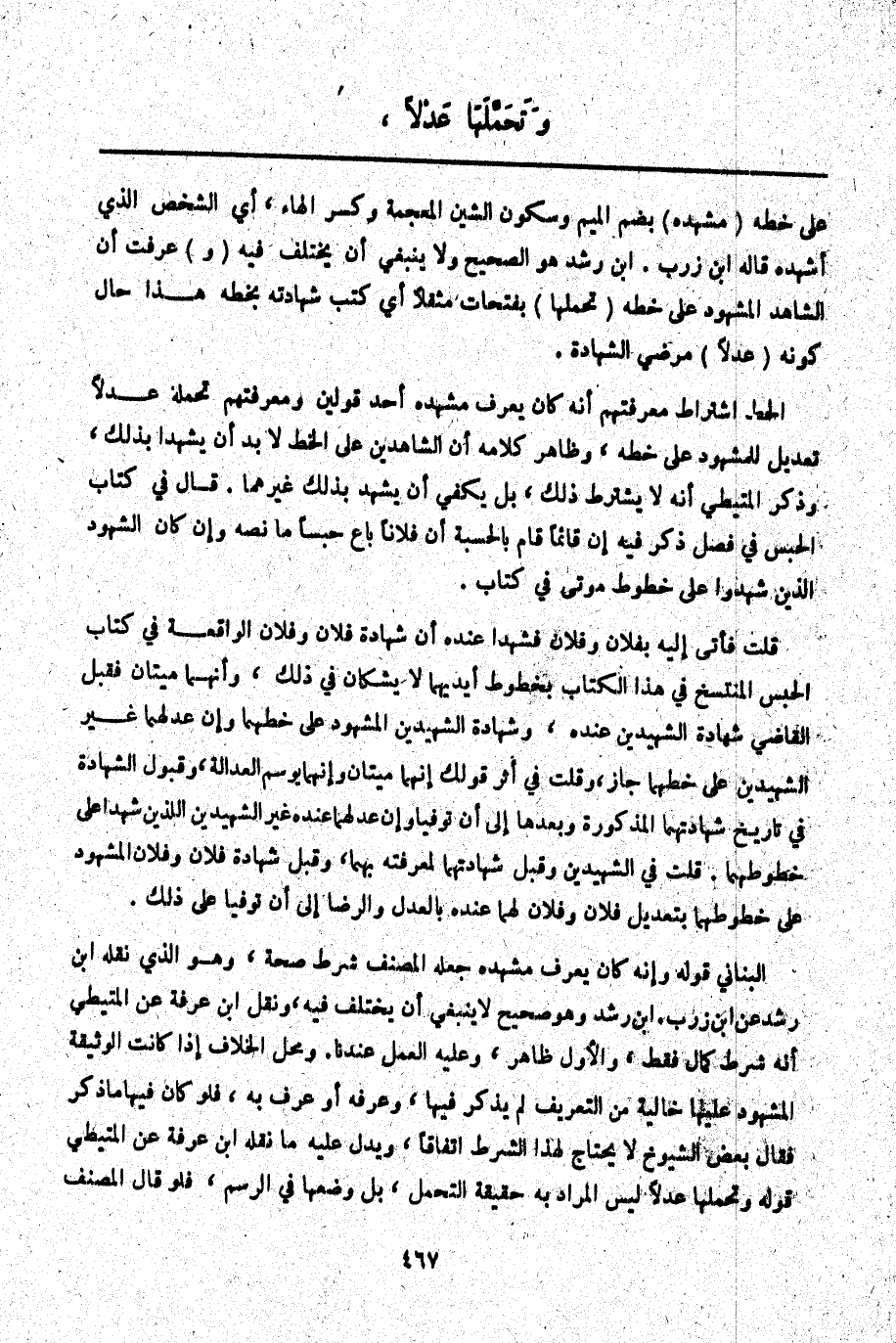 ـــــــــــــــــــــــــــــQعَلَى خَطِّهِ (مُشْهِدَهُ) بِضَمِّ الْمِيمِ وَسُكُونِ الشِّينِ الْمُعْجَمَةِ وَكَسْرِ الْهَاءِ، أَيْ الشَّخْصَ الَّذِي أَشْهَدَهُ قَالَهُ ابْنُ زَرْبٍ. ابْنُ رُشْدٍ هُوَ الصَّحِيحُ وَلَا يَنْبَغِي أَنْ يُخْتَلَفَ فِيهِ (وَ) عَرَفْت أَنَّ الشَّاهِدَ الْمَشْهُودَ عَلَى خَطِّهِ (تَحَمَّلَهَا) بِفَتَحَاتٍ مُثَقَّلًا أَيْ كَتَبَ شَهَادَتَهُ بِخَطِّهِ هَذَا حَالَ كَوْنِهِ (عَدْلًا) مَرْضِيَّ الشَّهَادَةِ.